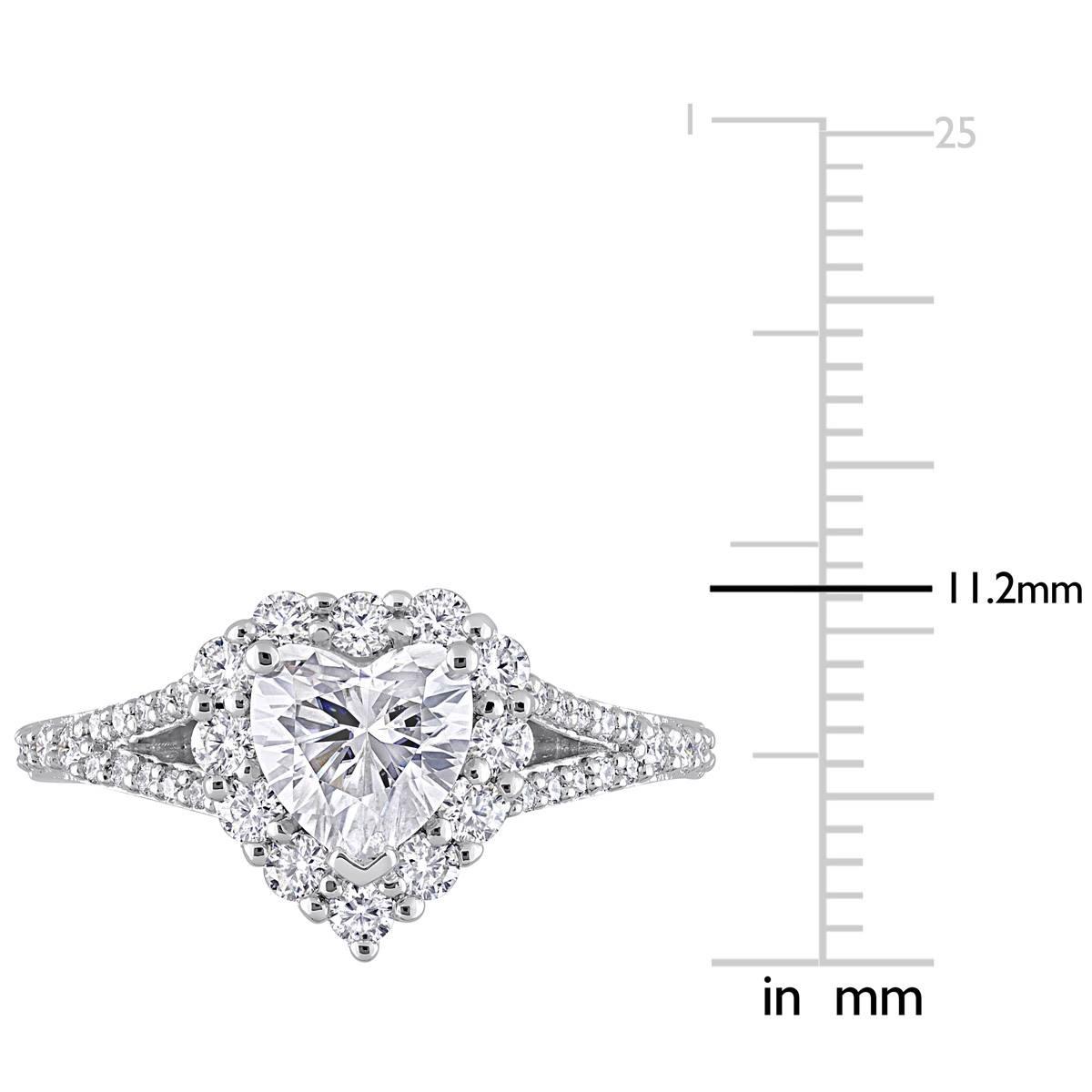 Impress her with this timeless Gemstone Classics™ vintage engagement ring. Mounted in dazzling sterling silver, this ring features a heart-shaped, prong-set created white moissanite gemstone at the center with 22 round-cut, prong-set created white moissanite gemstones on the band. Polished to brilliance, this ring is a symbol of love and unity.