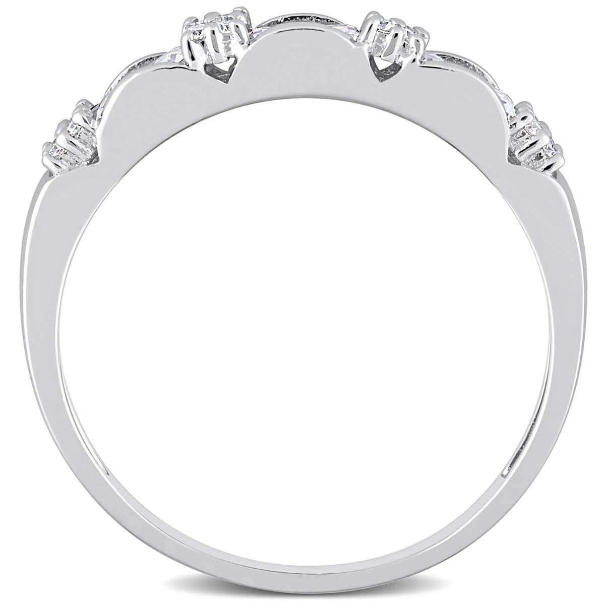 Description This Gemstone Classics™ baguette-cut moissanite anniversary band is crafted in sterling silver. This stunning semi-eternity ring features three baguette-cut and 16...
