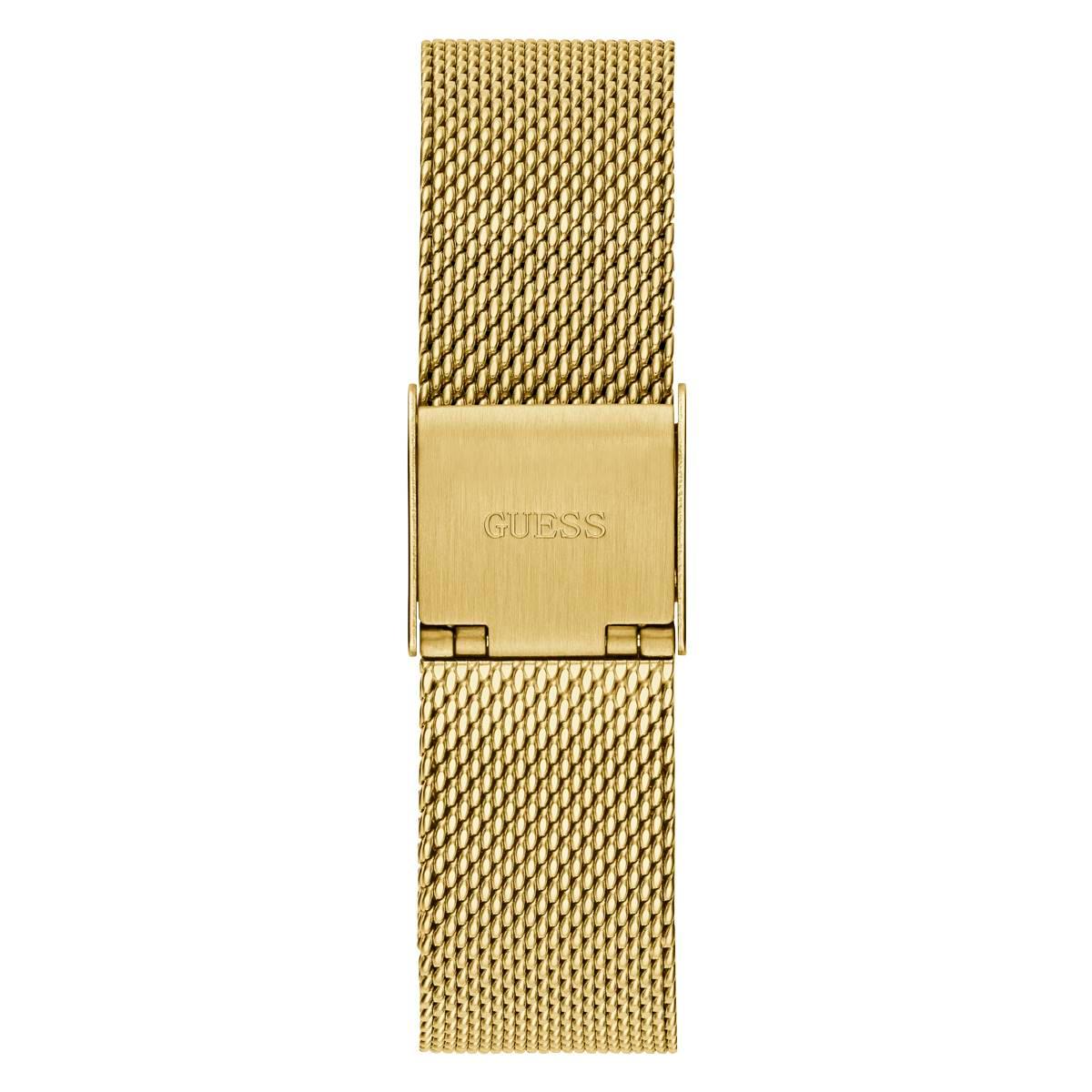 Bring the look of luxury with this Womens Guess elegant timepiece that features a NEW rounded square case surrounded by crystals and a self-adjustable mesh bracelet. Water-resistant 30M. Goldtone Stainless steel case.Band