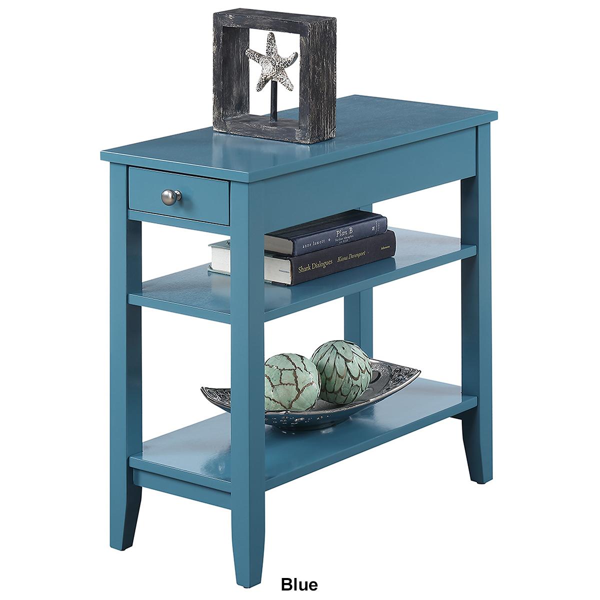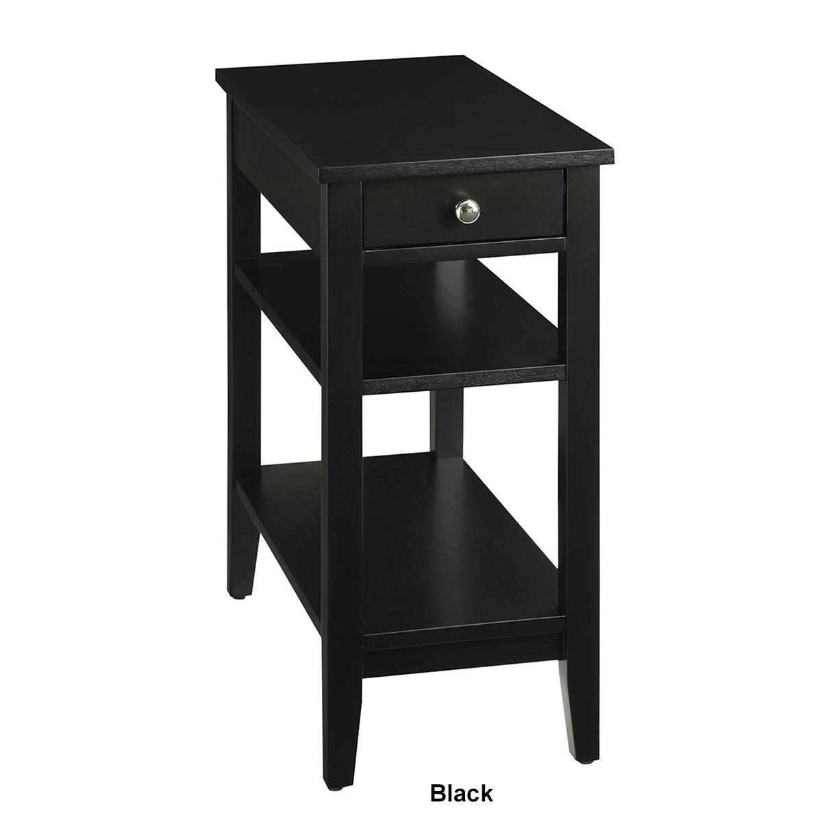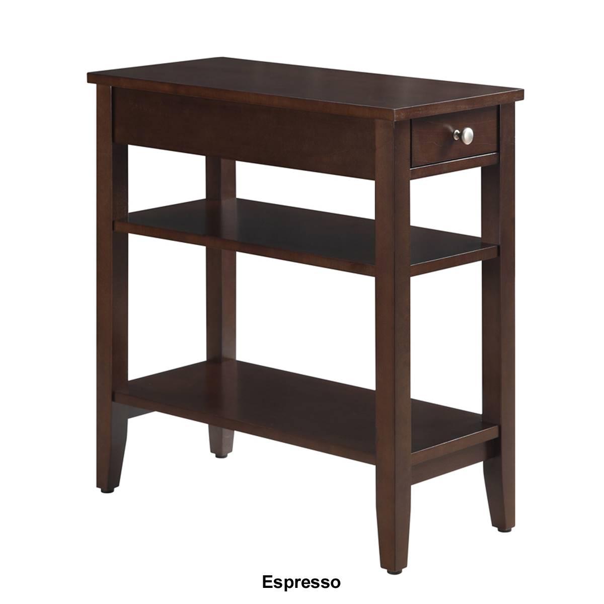 This Convenience Concepts American Heritage Chairside End Table is the perfect complement to any home. Featuring a drawer for hidden storage, you can hide away unsightly controls and accessories. Also featuring a middle and bottom shelf, you will have plenty of space to display collectibles or store magazines.