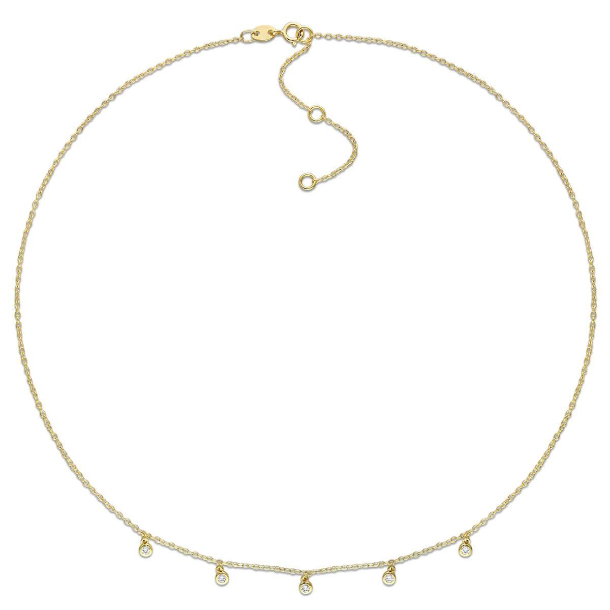 Capture the delicate shy smile on her face when you gift this Gemstone Classics™ lab grown diamond station necklace. Crafted in sparkling 18kt. yellow gold plated sterling silver, this necklace features five round-cut, glittering lab grown diamond that are embellished on the necklace in a bezel setting. Suspended on an 18-inch round cable chain, this necklace is secured with a spring ring clasp. Polished to a brilliant shine, this necklace is the perfect addition to any jewelry collection.