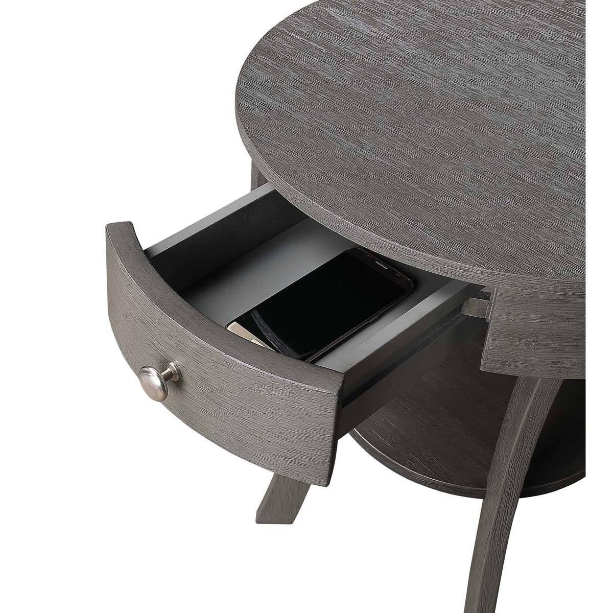 This Convenience Concepts Classic Living Rooms Schaffer End Table has a charming aesthetic that will transform your space. Featuring a drawer for concealed storage with a classic silver finish drawer pull that complements the already sleek design. The narrow bottom shelf provides additional display area while pulling together the look with elegantly curved legs.