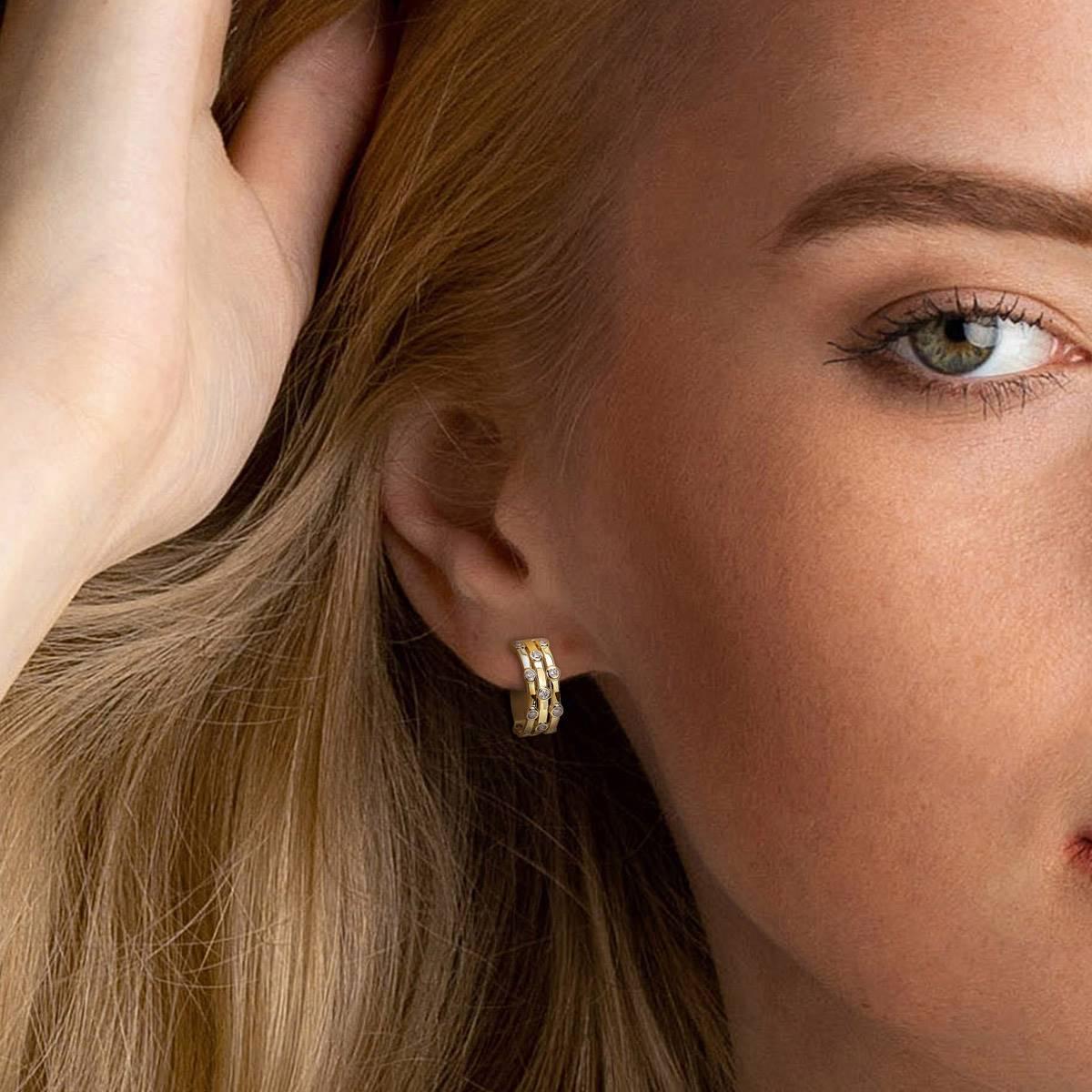 Create a buzz with these Gemstone Classics™ lab grown diamond open station triple row hoop earrings. Crafted in lustrous 18kt. yellow gold plated sterling silver, they feature 28 round-cut, bezel-set lab grown diamond studded in a station motif. Polished to a brilliant shine, these glittering earrings are secured with butterfly closures. Coordinate these earrings with any casual or business attire and look stunning.