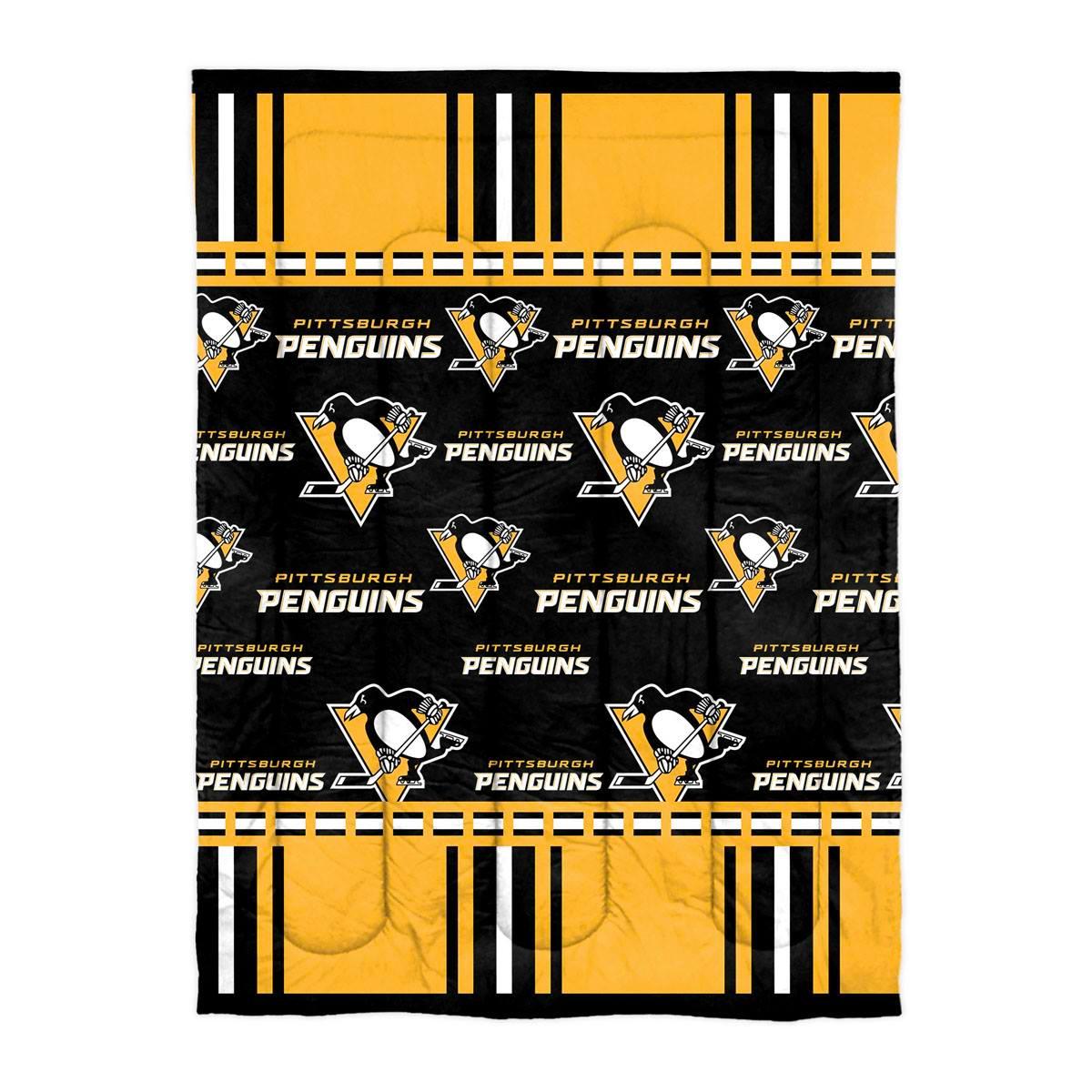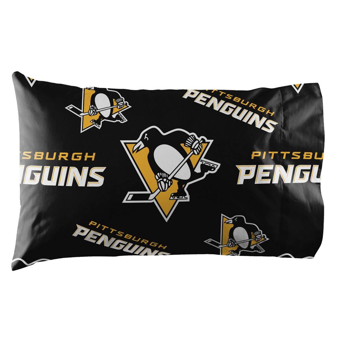 Dream about winning on game day while cozy in The Northwest Company officially licensed NHL Pittsburgh Penguins bed in a bag set. Designed around your favorite hockey team, this bedding set features a repeating print of team name and logos on the comforter and pillowcase, on a team-colored background. The sheets match, with a repeating print of team logos on a white background.