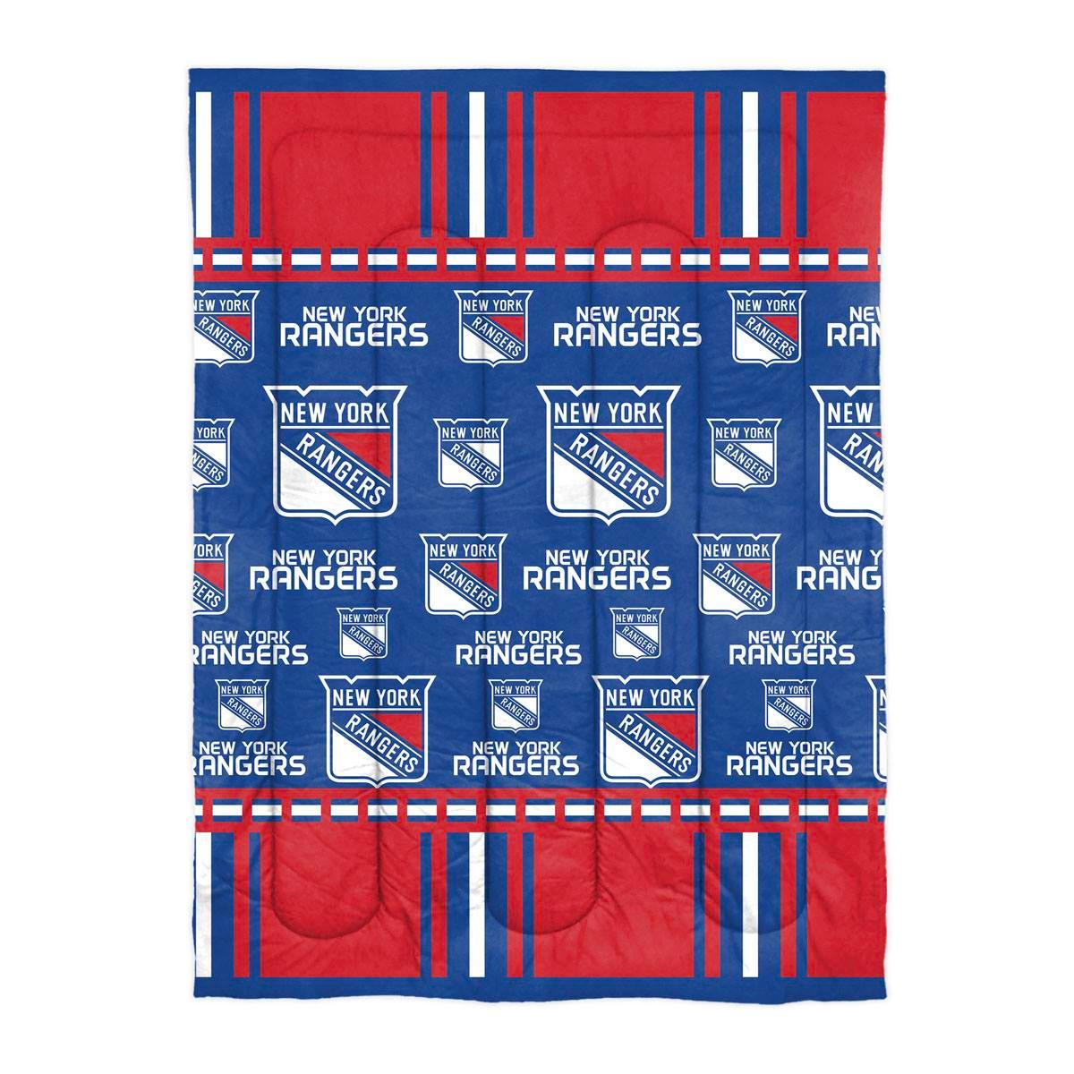 Dream about winning on game day while cozy in The Northwest Company officially licensed NHL NY Rangers bed in a bag set. Designed around your favorite hockey team, this twin bedding set features a repeating print of team name and logos on the comforter and pillowcase, on a team-colored background. The sheets match, with a repeating print of team logos on a white background.