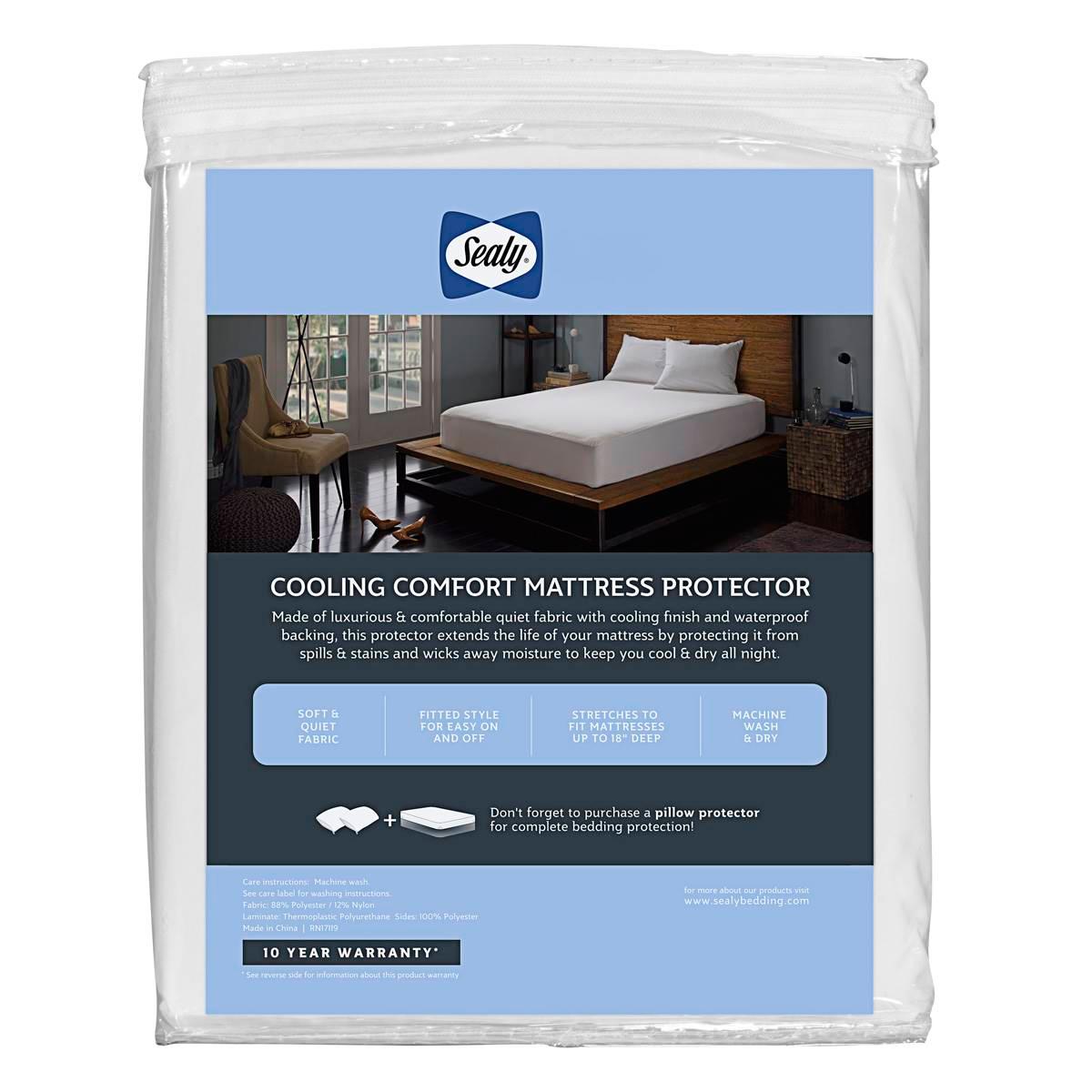 Description The Sealy® cool comfort fitted mattress protector is made with a soft, comfortable fabric with a cooling finish. This breathable mattress protector wicks away...