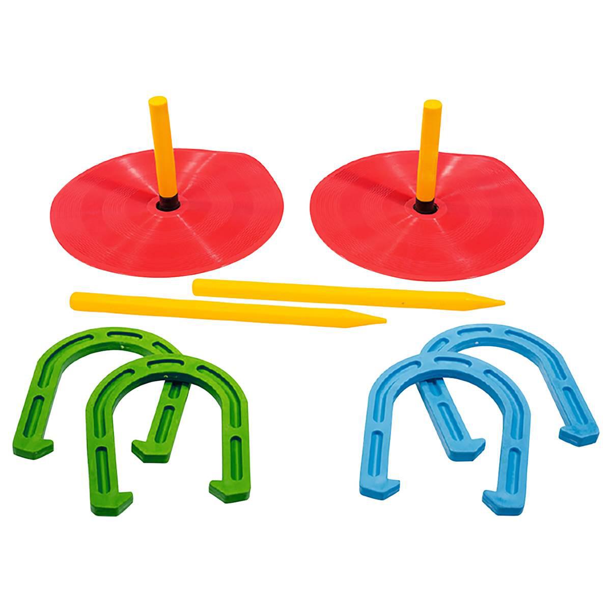 The Franklin Sports horseshoe set is a classic game made specifically for kids! This version of horseshoes is designed to be used either indoors or outdoors by creating a set made of soft, durable materials that kids can play with over and over. The set includes (4) kid-friendly horseshoes (2 blue and 2 green), (2) traditional style stakes for outdoor use, and (2) convertible base/peg stakes for indoor or hard surface use. Take this set with you on your next BBQ, picnic, or set up inside for play.WARNING: CHOKING HAZARD - Small Parts. Not for children under 3 years.