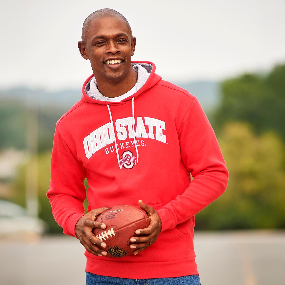 Represent your school this season with this Mens Champion® Ohio State University fleece pullover hoodie. The hoodie features the school name and logo across the chest, a drawstring hood, a soft fleece lining, and a kangaroo pocket.