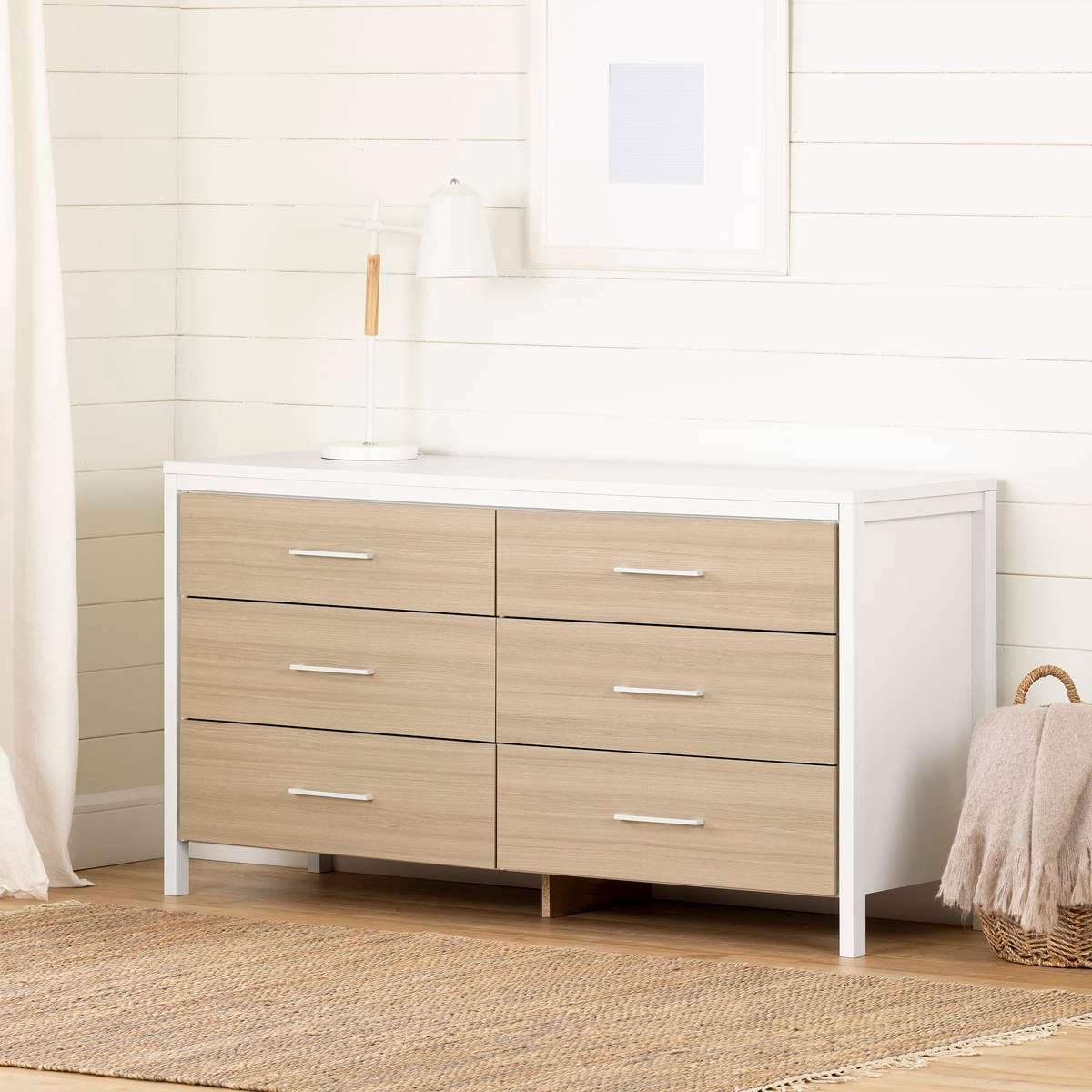 Make this South Shore Munich dresser the focal point of your room. Featuring extra tall legs, two tone textures, and slim metal handles, this dresser will blend in with any interior, whatever the theme. Featuring six large drawers with detailed metal handles, this double dresser provides plenty of room for clothes and linens. It also has metal drawer slides for smooth, quiet use. With that much space, staying organized has never been easier. You can even use the flat top to organize more things or to show off your favorite decorative items.