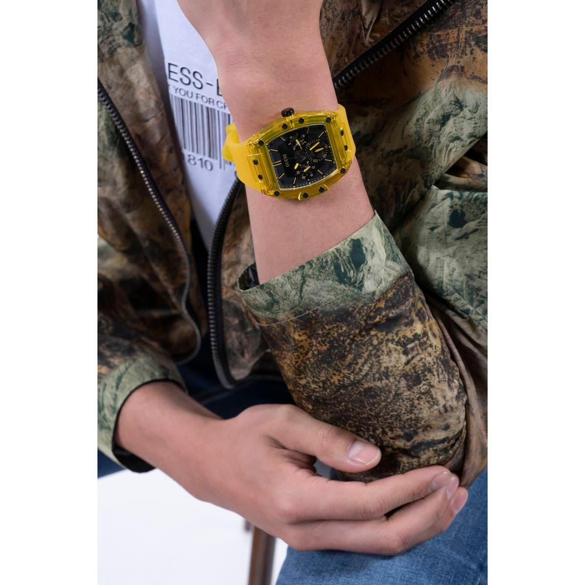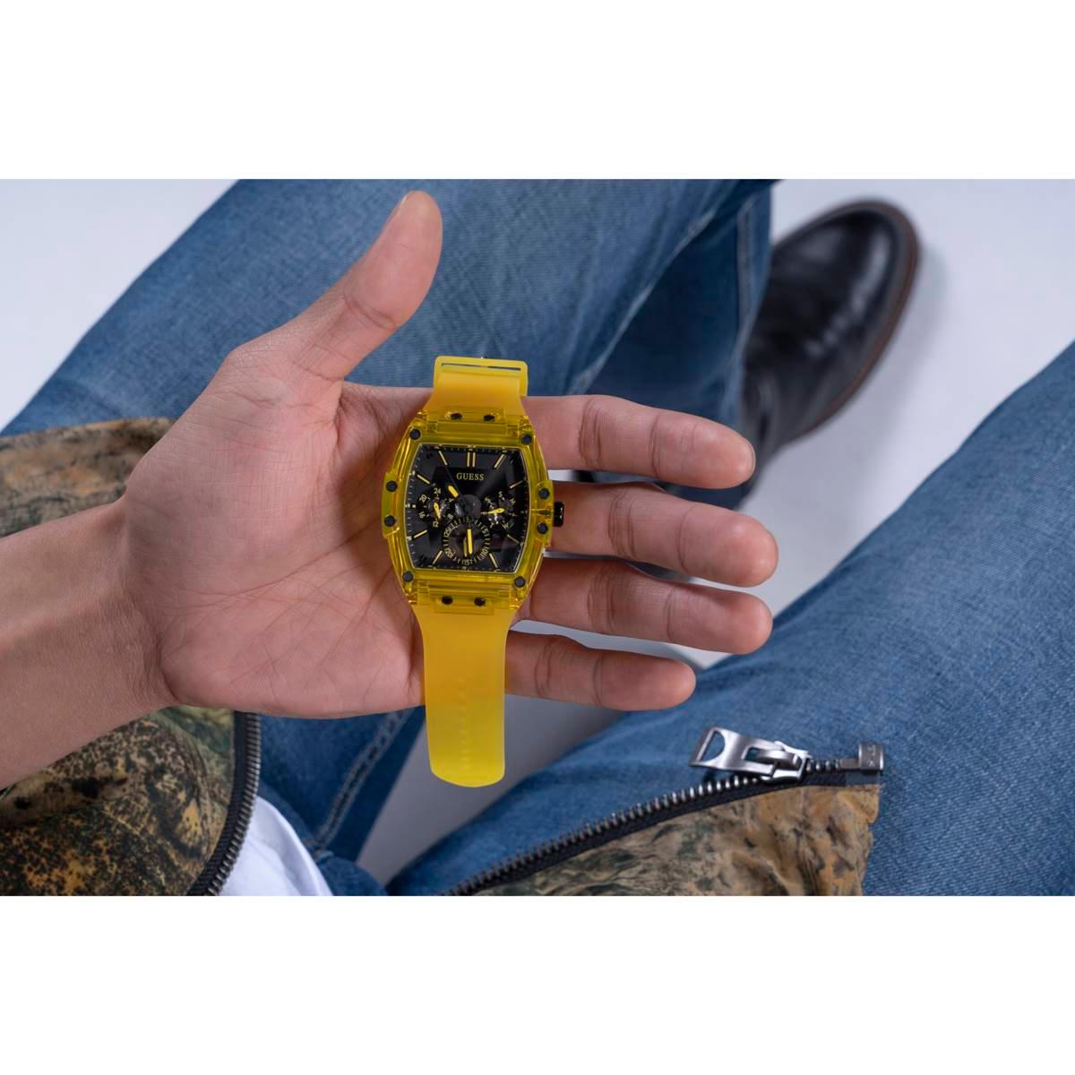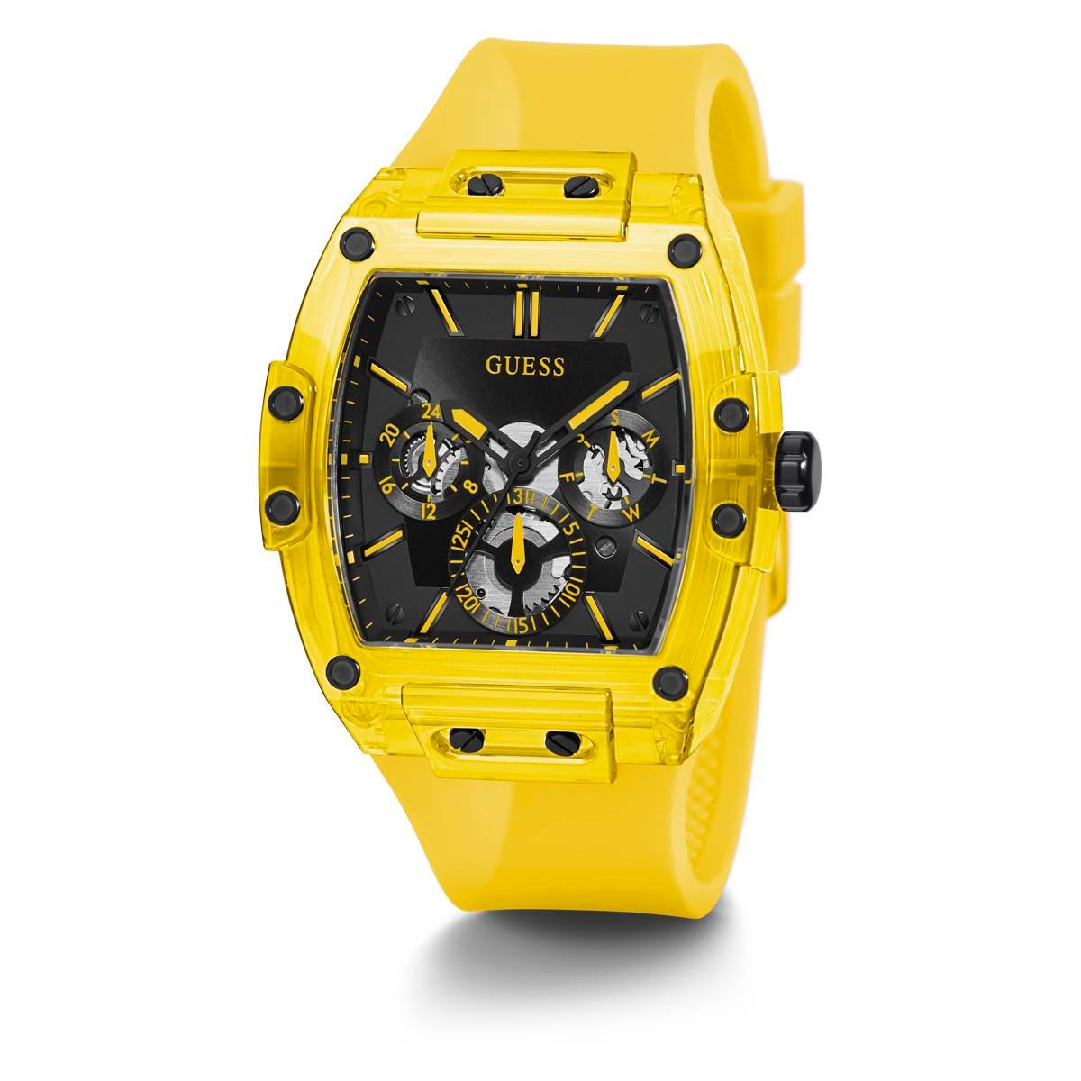Skeleton dial details keep this Mens GUESS watch on the rise. This style features a yellow nylon barrel shaped case with black screw details and a black multi-function dial paired with a yellow translucent silicone strap.