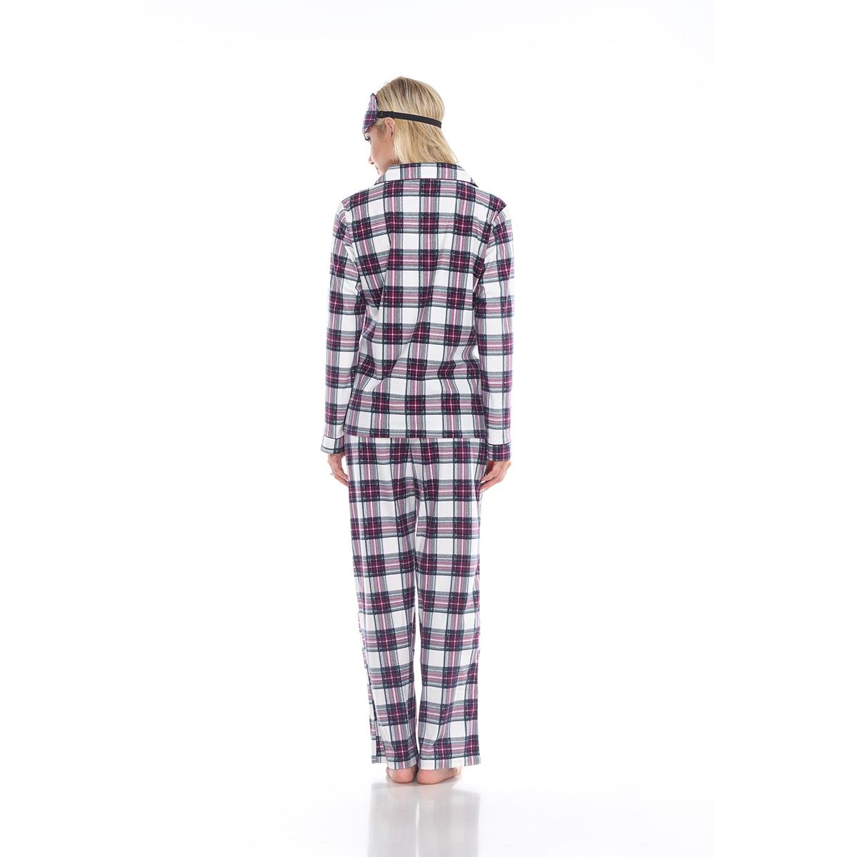The Womens White Mark plaid pajama set is very comfortable to touch and wear. The three-piece sleep set features a long-sleeve button-down top, long leg regular fit pants, and an eye mask. This set has a breathable fabric for your comfortable sleeping.