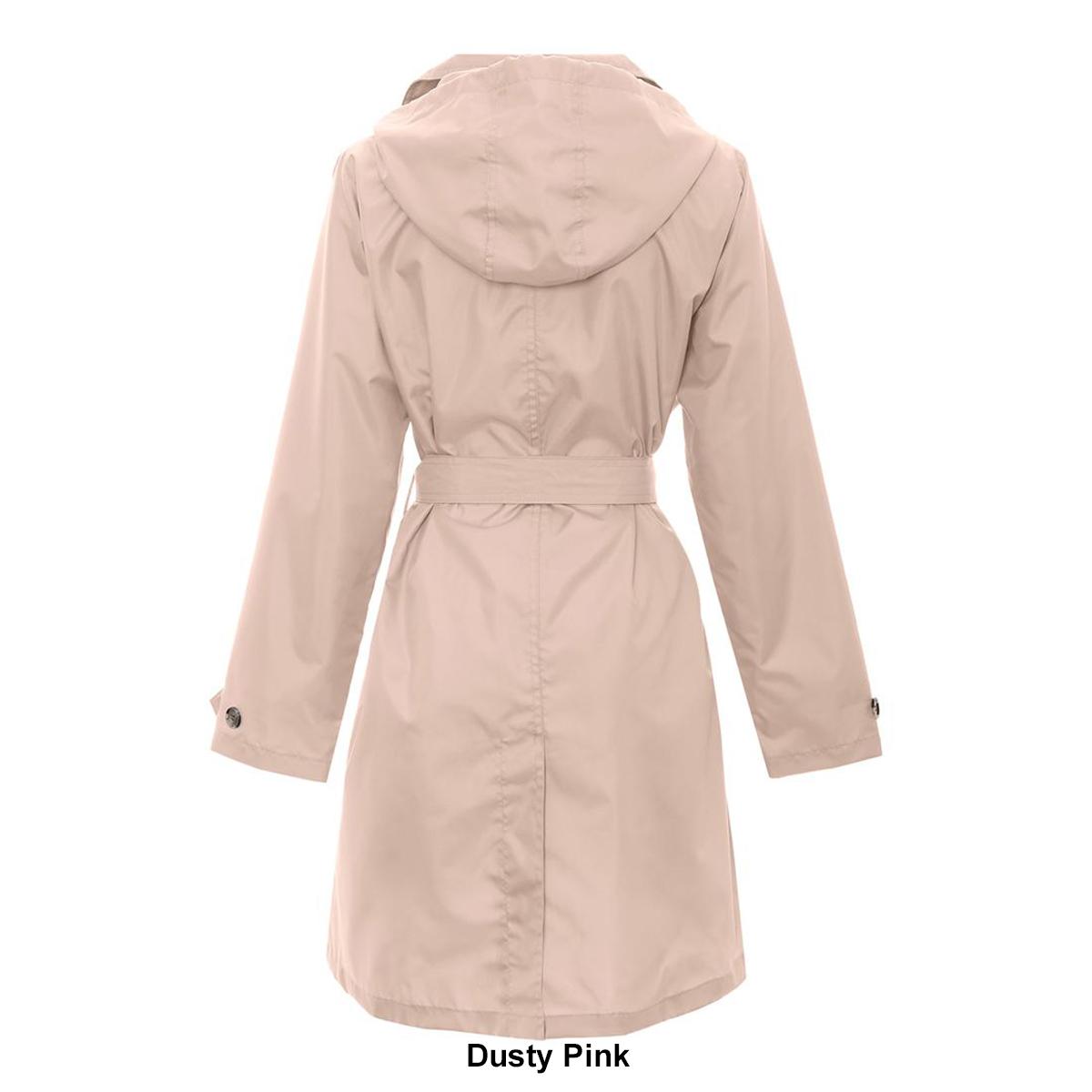 Womens Capelli solid mid length basic trench rain slicker with a removable hood. 100% Polyester with water resistant coating. Machine wash cold, inside out with like colors. Line dry. Cool iron, on the reverse side, when needed.