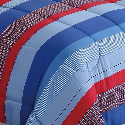 The My World kids Sebastian Stripe comforter set features easy to coordinate blue and red plaid patterns. The reverse side of the comforter is done in printed blue denim.