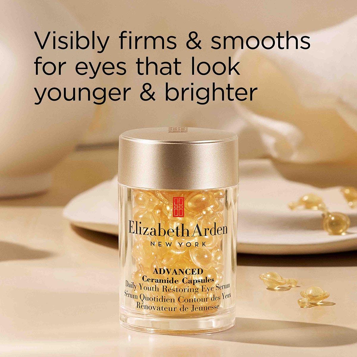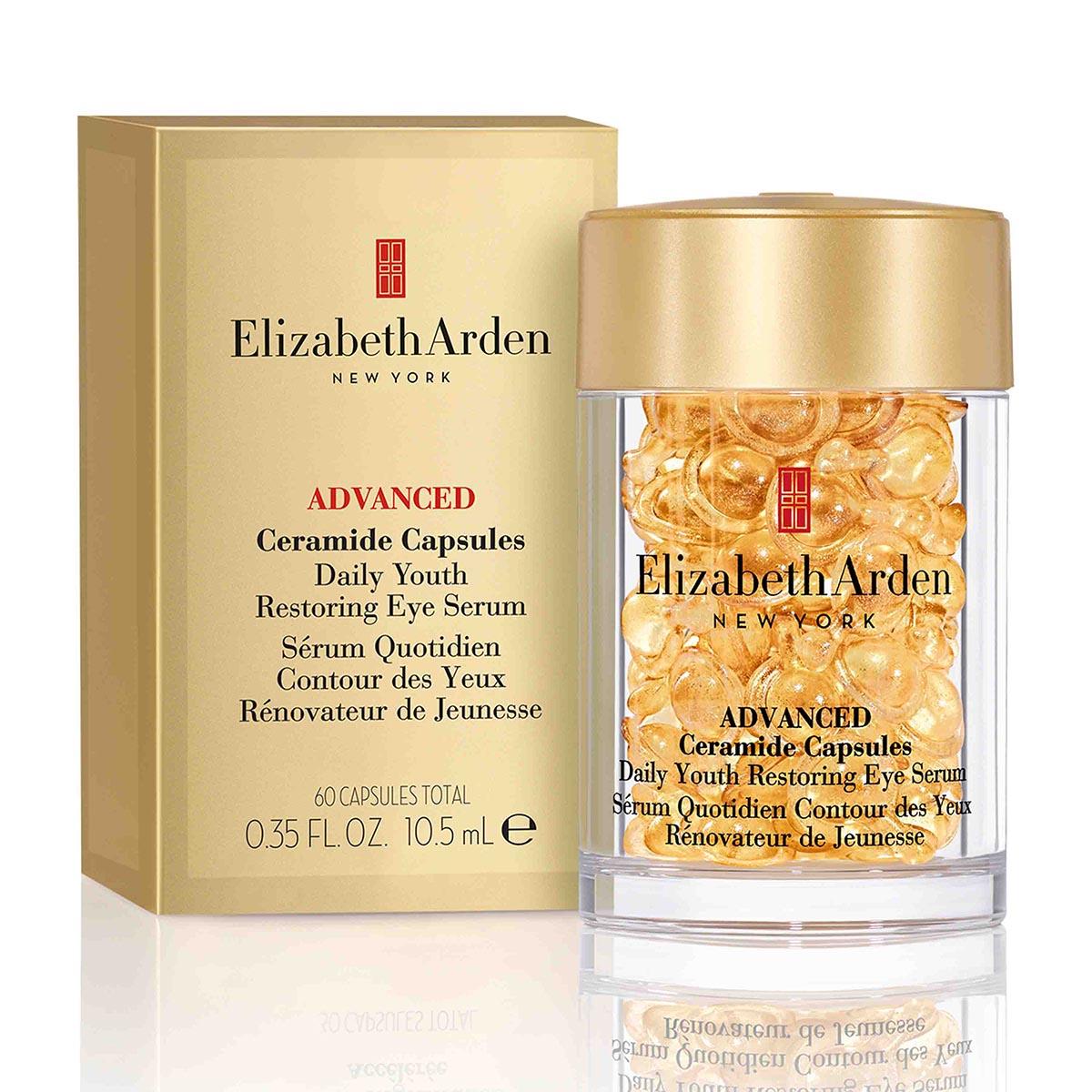 Elizabeth Arden Advanced Ceramide Capsules Daily Youth Restoring Eye Serum. A lightweight, silky-smooth, non-greasy eye serum in a capsule with advanced technology to give the delicate eye area a youth-restoring boost. Reduce the appearance of aging signs and revitalize and brighten the eye contour. Size: 60 capsules.