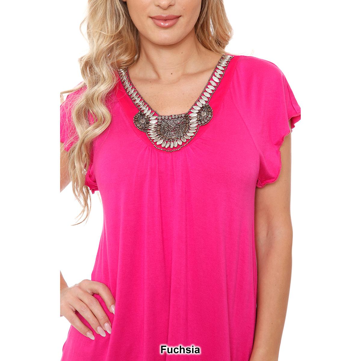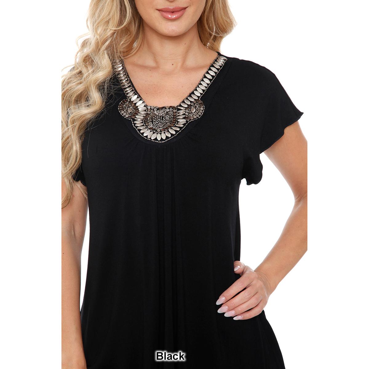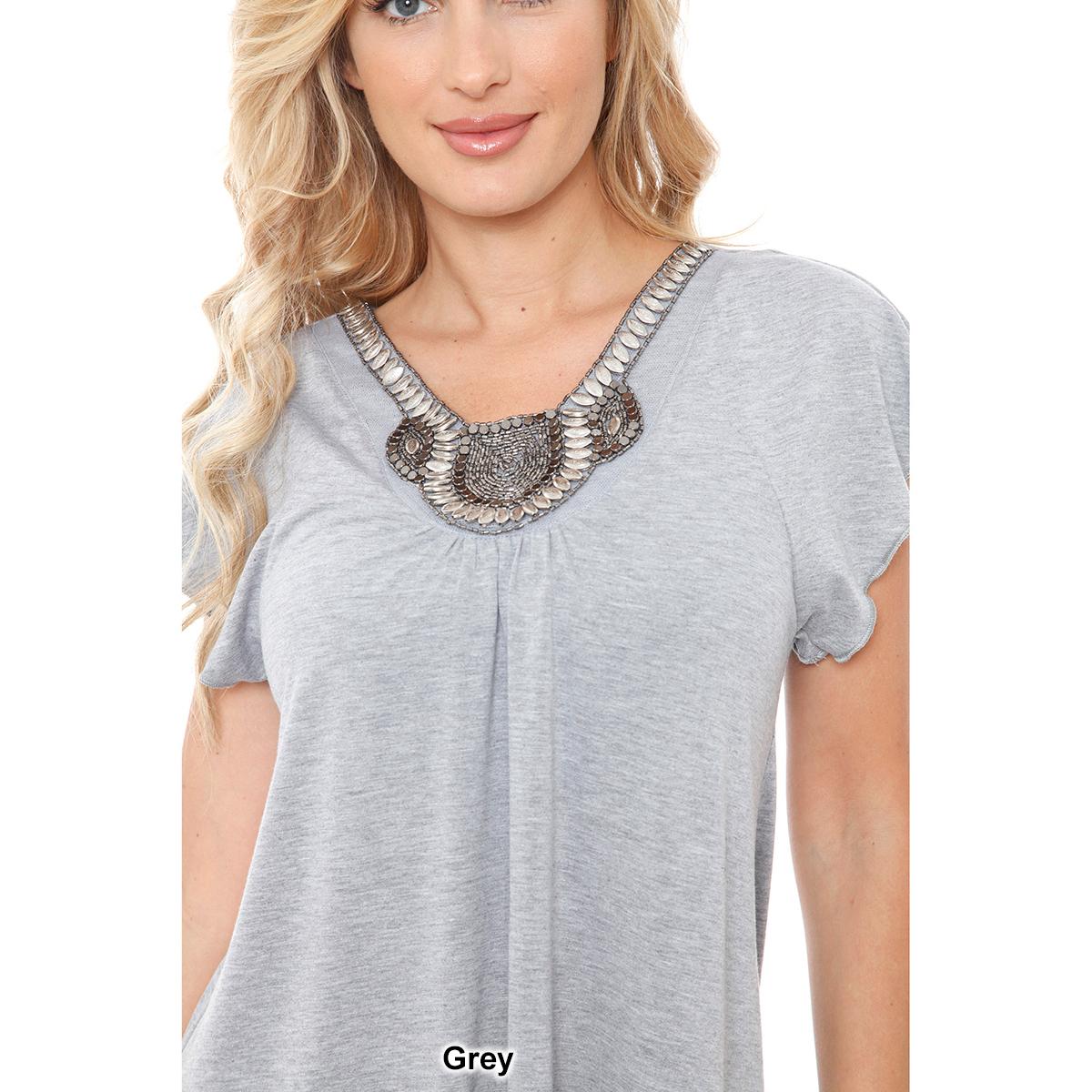 Designed with seamless, stretch fabric that snaps back into shape after every wear through pregnancy and beyond, this gorgeous Womens White Mark Myla tunic maternity top features a glimmering embellished neckline. Finished with an asymmetric hemline, this top has short sleeves and a flowing fit.