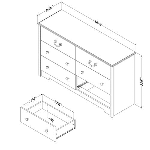 With its unique handles and trendy finish, this South Shore 6 drawer double dresser from the Aviron collection showcases a truly original nautical style. It is sure to be the centerpiece of your kid’s room with its storage spaces. This dresser showcases rope like upper handles and plastic ones in a silver finish below.