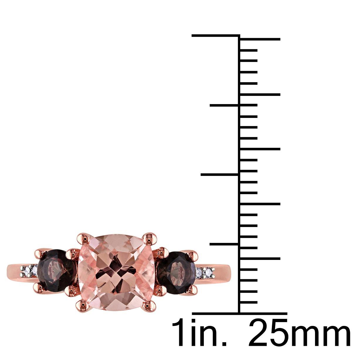 This Gemstone Classics™ silver morganite and smokey quartz ring is an elegant 3-stone ring. Featuring a cushion-cut morganite center stone with two round-cut smokey quartz and four round white diamond side stones set in rose plated silver. This stylish ring is enhanced with a high polish finish.