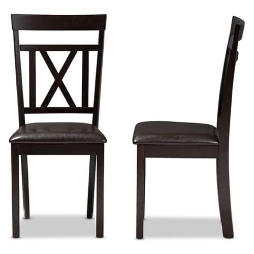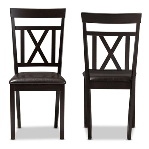 These Baxton Studio Rosie dining chairs come as a set of 2 are modern and contemporary and celebrates simplicity by combining timeless and contemporary elements. The chairs’ high, X-back design offers comfort and grace and the dark brown, wenge finished wood matches perfectly with dark brown faux leather padded seats. They feature tapered legs that imbue modern essence.