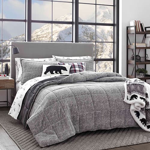 This Eddie Bauer Sherwood comforter set will make your bedroom into a cabin retreat. The plush micro-suede grey face reverses to a heathered grey Sherpa. It is sure to keep you warm and cozy throughout those frigid winter nights. The pillow shams feature a Euro side closure. This set includes one comforter and sham(s). 100% Polyester. Machine wash cold. Tumble dry low.