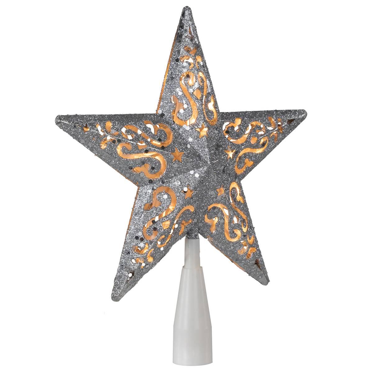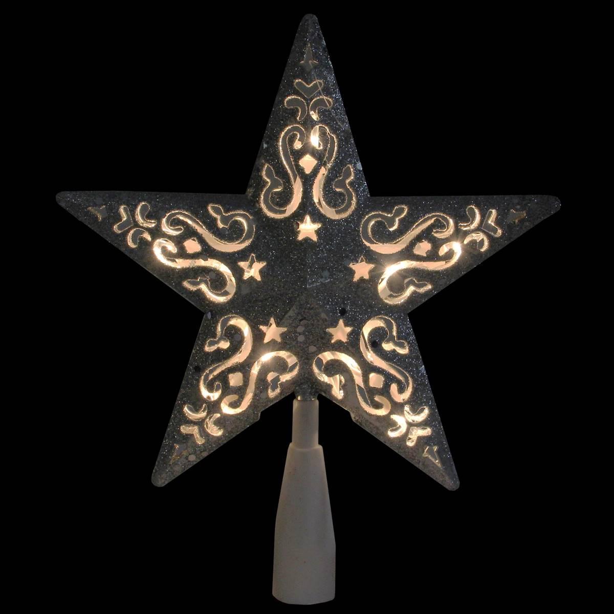 Crown your Christmas tree with this traditional 5-point star tree topper from Northlight Seasonal. Features a decorative cut-out swirl and star design. The topper comes with 10 clear colored mini bulbs on white wire with a 24-inch lead cord. This double-sided design has steady burning bulbs that are UL listed for indoor use only and if one bulb burns out the rest will stay lit. Contains 1 plug with end connector which allows you to stack multiple sets of lights together, not to exceed 210 watts. Comes with replacement bulbs, spare fuse and cone to attach to the tree.