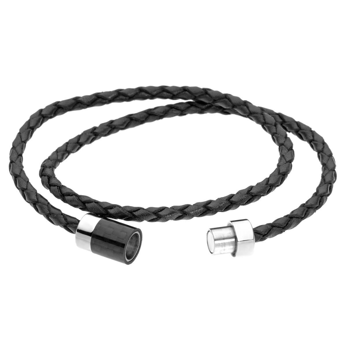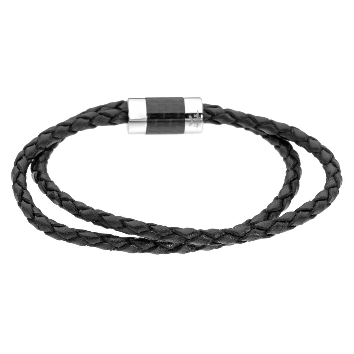 The perfect everyday touch, this Mens Lynx stainless steel leather and carbon fashion bracelet easily updates his wardrobe. The bracelet features leather ropes connected with a carbon fiber link that is secured with a magnetic clasp which gives this bracelet unique style.
