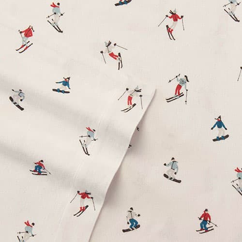 This Eddie Bauer Ski Slope flannel sheet set features a print of skis and snowboards on 100% brushed cotton flannel. Thread count: 160. Machine wash, cold. Do not bleach. Tumble dry, gentle on low heat. Iron on low.