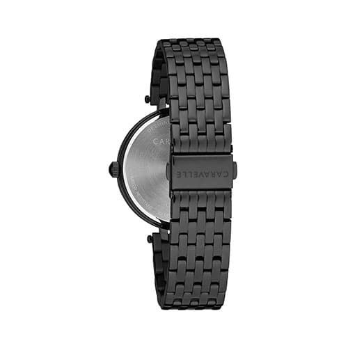 The Womens Caravelle IP stainless steel watch showcases 60 individually hand set crystals on its bezel. It features a black crystal dial, a second hand, and uses a double pusher fold over buckle for closure. This watch is water resistant up to 30 meters. Case dimensions: 38mm.Style 45L171.Limited Manufacturer´s Warranty.