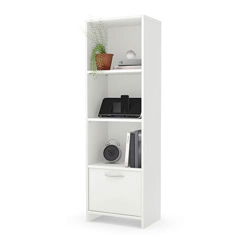 With its contemporary style and straight lines, this versatile South Shore 3 shelf bookcase with door from the Step One collection will blend perfectly with other furniture in the room. This bookcase has multiple functions and also acts as the ideal media tower for holding your DVDs and game console. This piece features 3 open storage spaces separated by 2 adjustable shelves, and a closed storage space at the bottom.