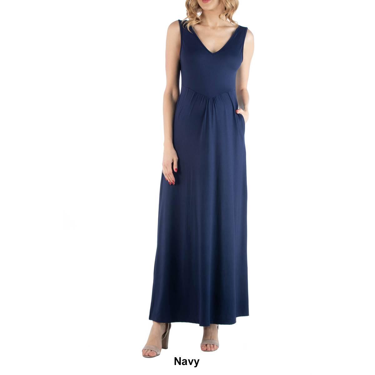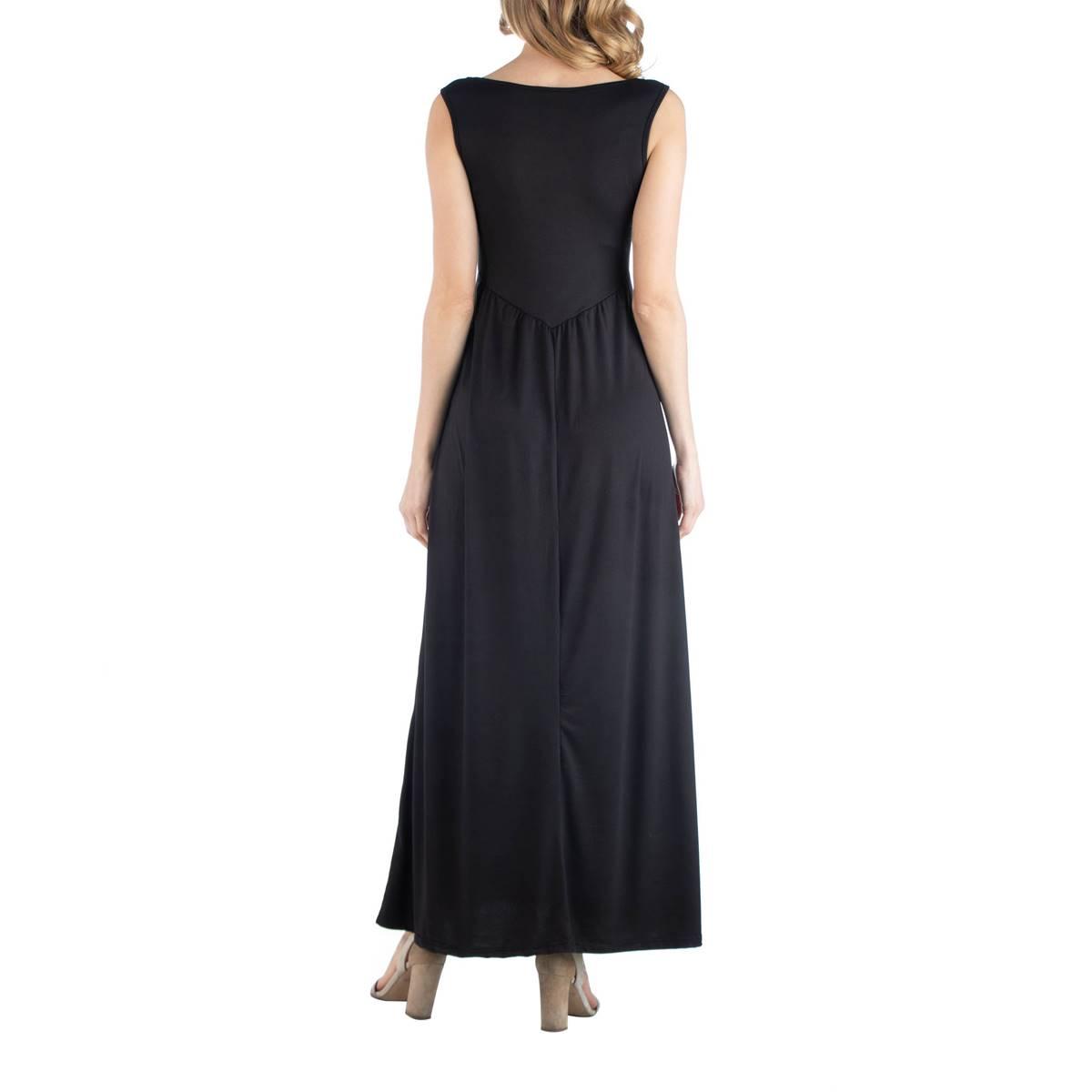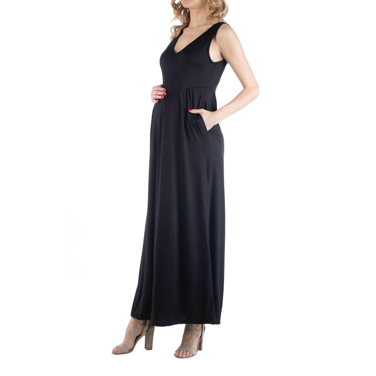 This elegant Plus Size 24/7 Comfort Apparel sleeveless maternity maxi dress is versatile enough for all occasions. Style with a hat and sandals for a day at the beach or jewelry and dressy shoes for a chic evening look. Perfect for those sunny spring and summer days, this dress features a v neck, slim fit, and has pockets for added convenience.