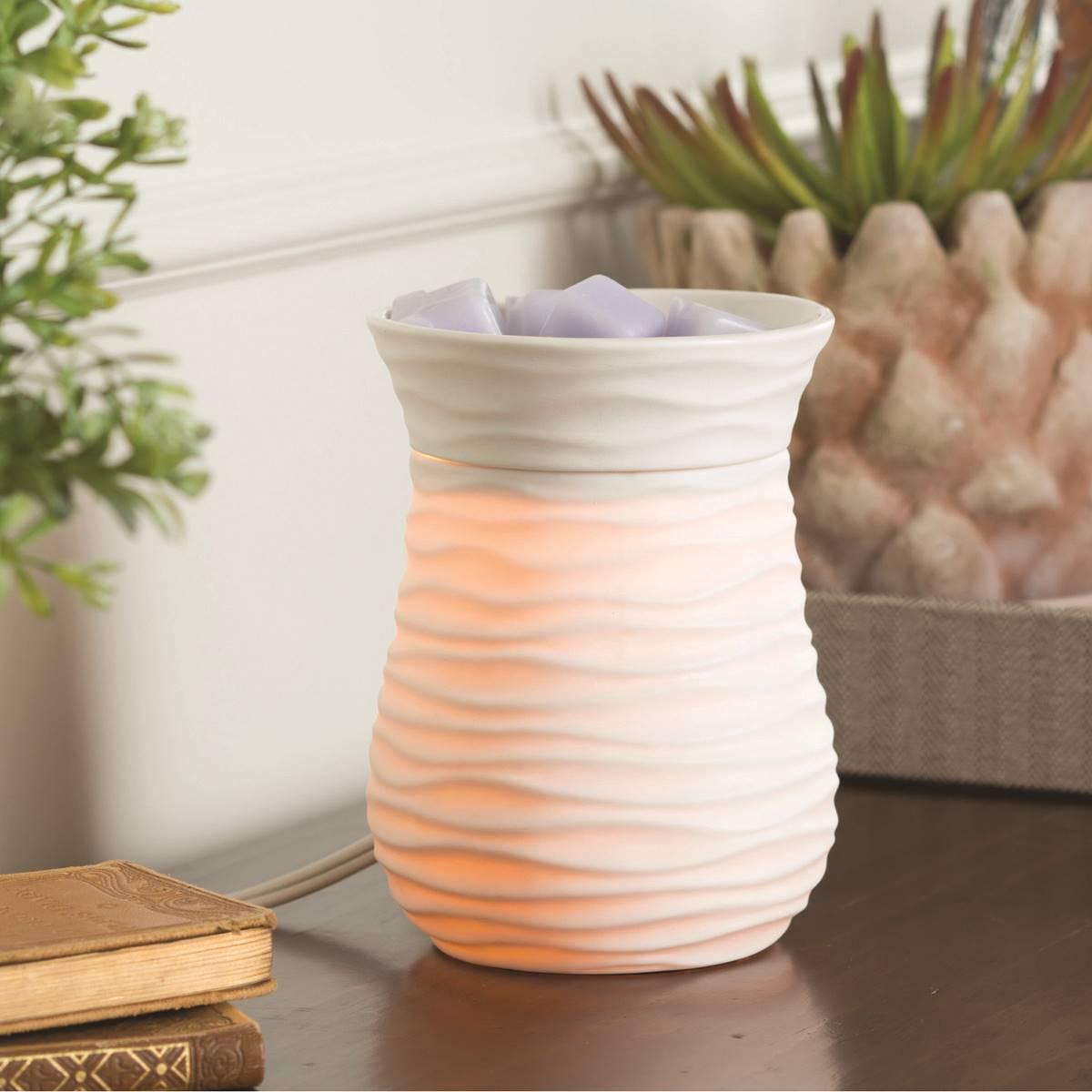 The Candle Warmers Etc. Harmony Illumination Wax Warmer features gentle waves of ivory across a matte ceramic body. This wax warmer uses a halogen bulb to warm wax melts in the dish, releasing their fragrance. The soft glow of the bulb creates the ambiance and fragrance of a lit candle, without flame, soot, or other pollutants. Simply add wax melts to the dish, turn it on, and enjoy your favorite fragrance as it spreads through the room.Limited Manufacturer´s Warranty.