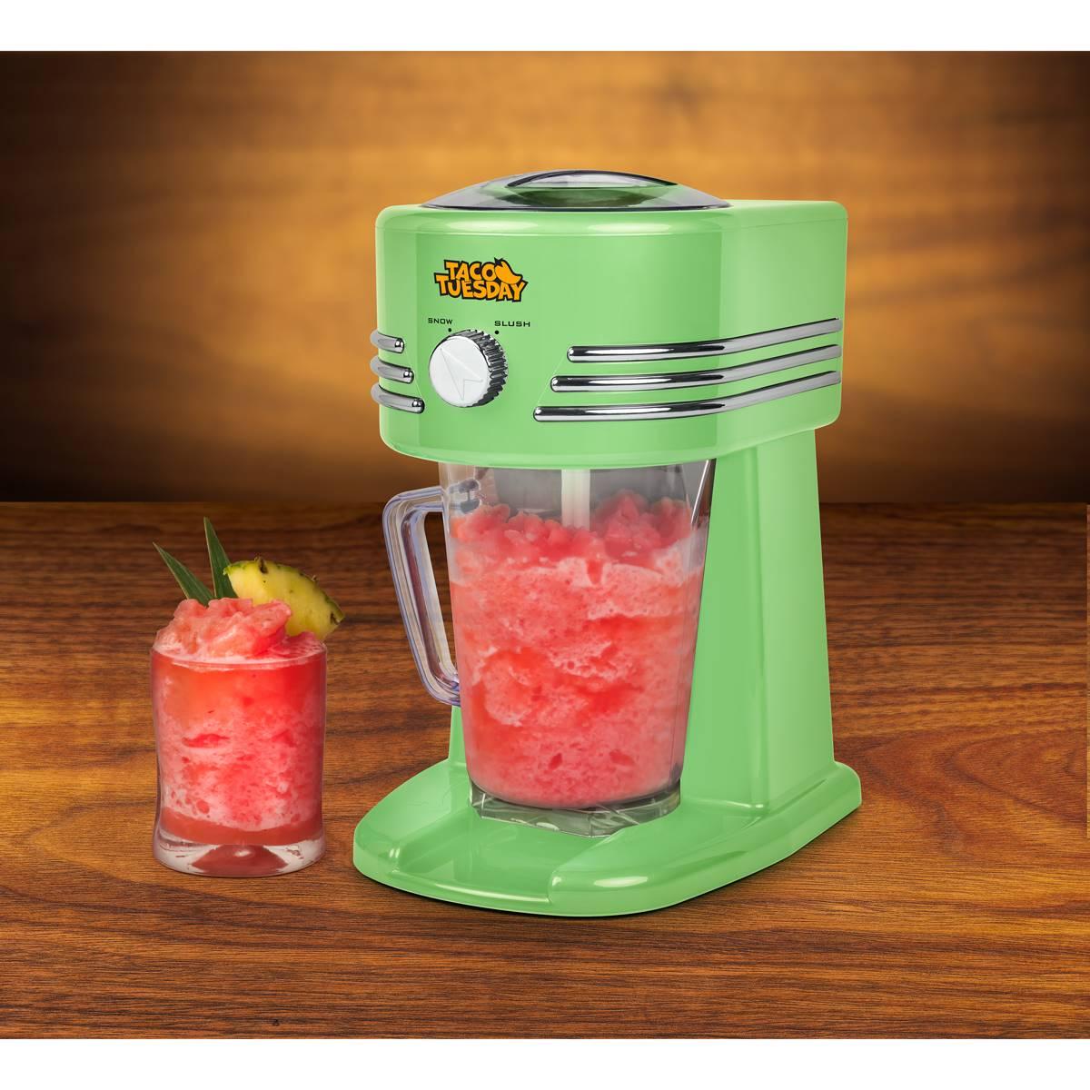 This Taco Tuesday frozen beverage station features two shaving settings that produce coarse or fine ice textures. While the ice is being shaved, the mixing paddle simultaneously stirs the frozen beverage. The 40 ounce capacity pitcher is great for making slush drinks, snow cones, margaritas, daiquiris, and more, and perfect for any Fiesta. Has two shave settings that produce either snow or slush ice texture allowing you to be creative depending on the recipe. Fill the shaving cage with regular-sized ice cubes for the best results.