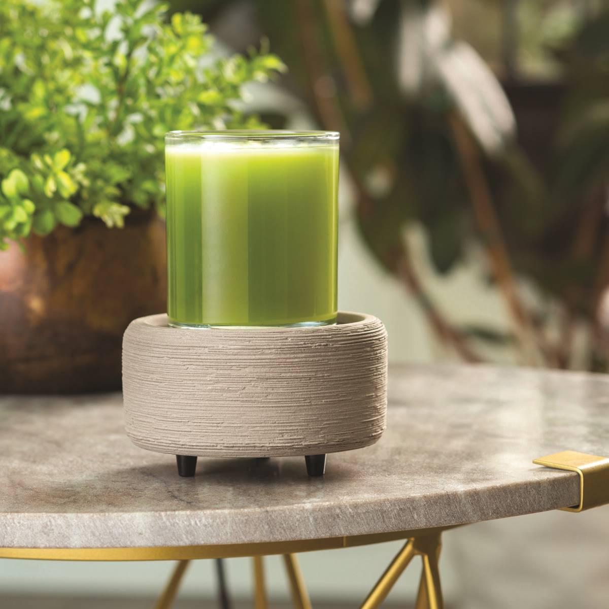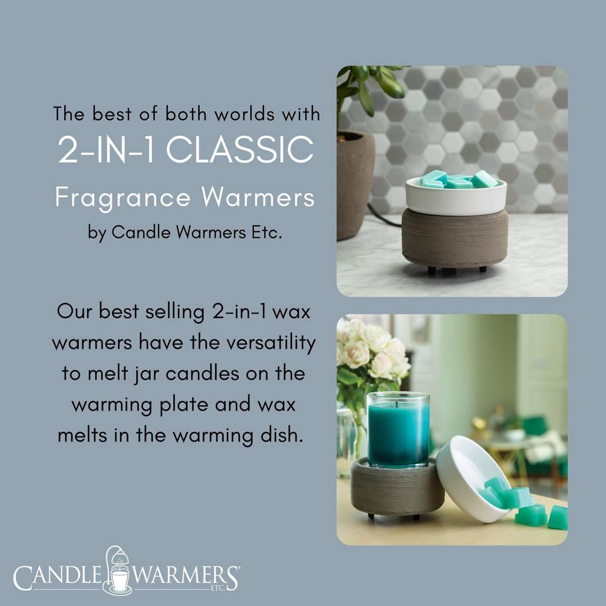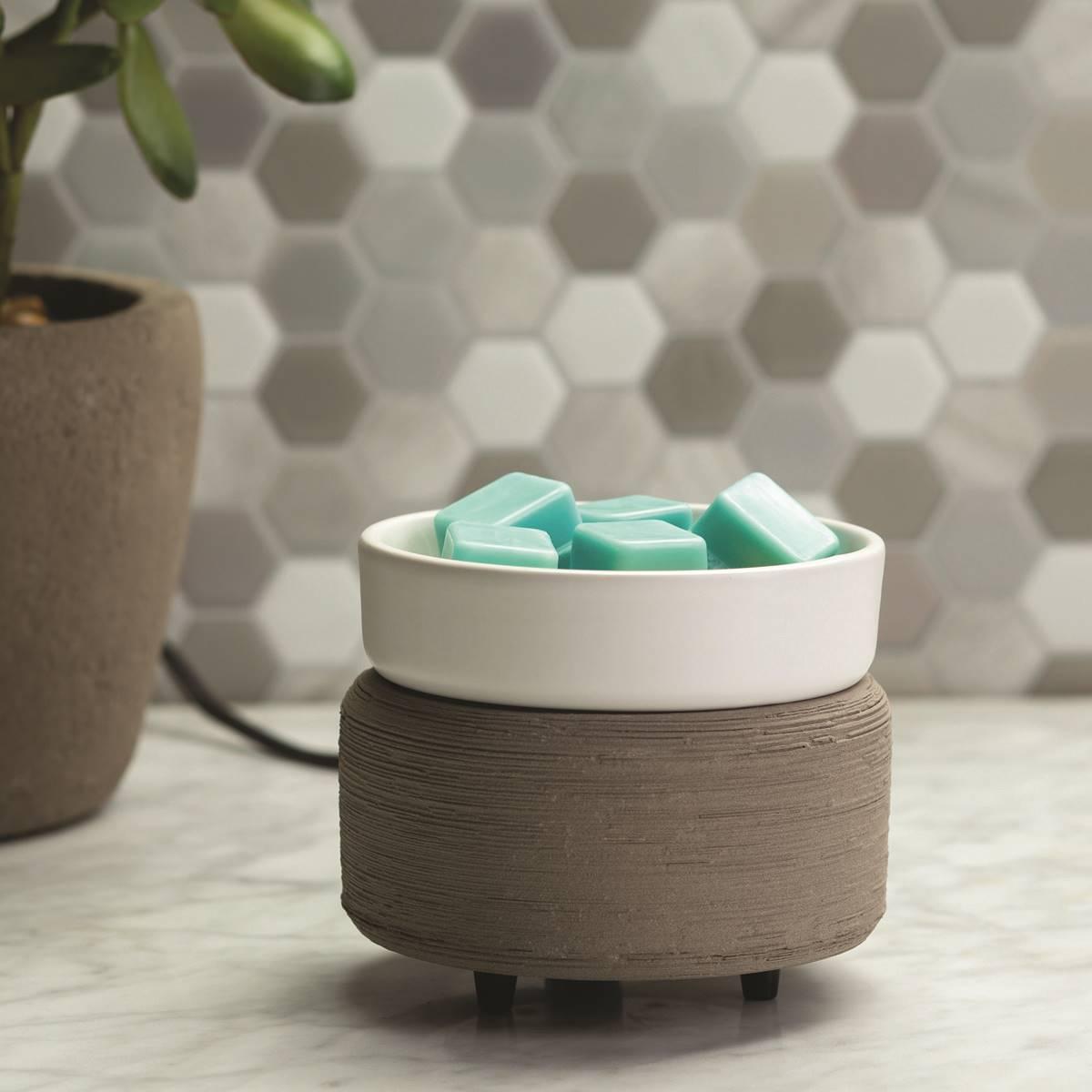 The Candle Warmers Etc. Bronze Geometric 2-in-1 Wax Warmer features semi-rough textured ceramic and brushed concrete, offset with a soft matte white dish. It features a versatile design that allows you to warm wax melts in the dish, or place a jar candle directly on the warming plate. Candle and wax warmers allow you to enjoy the fragrance of a lit candle, without flame, soot, or other pollutants. Simply place your favorite candle on the warming plate, or add wax melts to the dish, turn it on, and enjoy your favorite fragrance as it spreads through the room.
