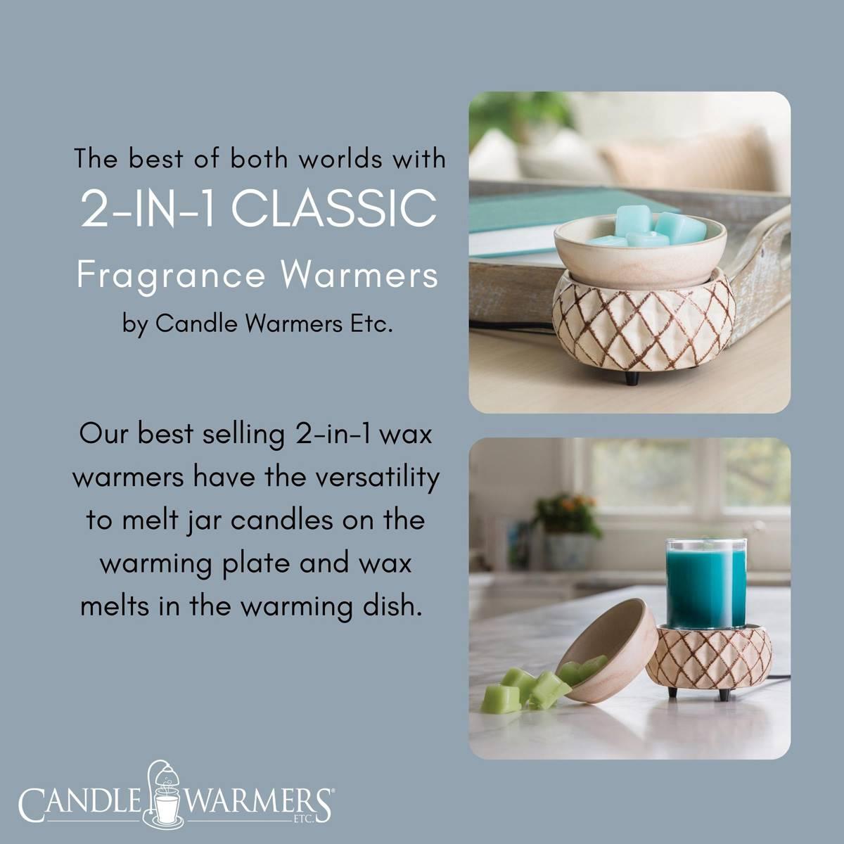 The Candle Warmers Etc. Lattice 2-in-1 Wax Warmer features a vintage cream finish with a reactive glaze and lattice pattern, making this warmer an instant classic. It features a versatile design that allows you to warm wax melts in the dish, or place a jar candle directly on the warming plate. Candle and wax warmers allow you to enjoy the fragrance of a lit candle, without flame, soot, or other pollutants. Simply place your favorite candle on the warming plate, or add wax melts to the dish, turn it on, and enjoy your favorite fragrance as it spreads through the room.