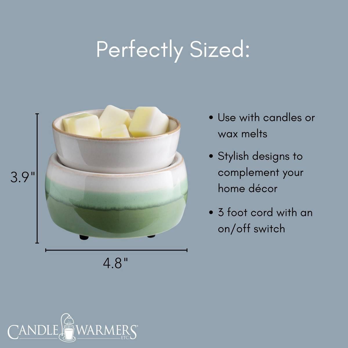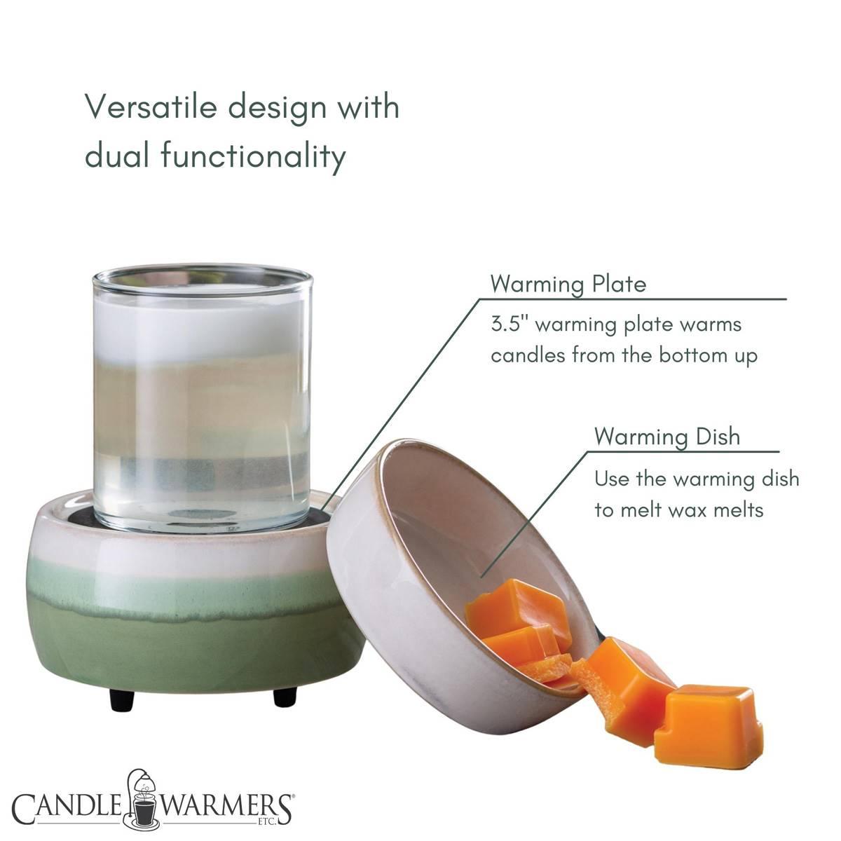 The Candle Warmers Etc. Matcha Latte 2-in-1 Wax Warmer features a reactive creamy glaze on top and mossy green on the bottom to create a frothy mint focal point where they overlap. It features a versatile design that allows you to warm wax melts in the dish, or place a jar candle directly on the warming plate. Candle and wax warmers allow you to enjoy the fragrance of a lit candle, without flame, soot, or other pollutants. Simply place your favorite candle on the warming plate, or add wax melts to the dish, turn it on, and enjoy your favorite fragrance as it spreads through the room.