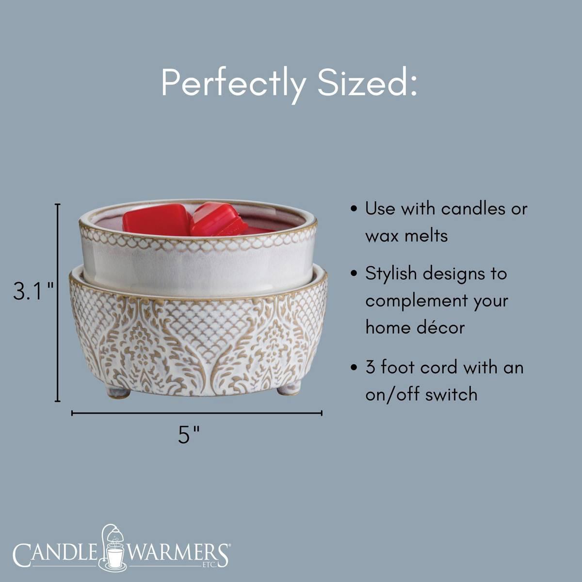 Description The Candle Warmers Etc. Vintage White 2-in-1 Wax Warmer is patterned like flocked wallpaper in an antique white reactive glaze and soft scalloping. It features a...