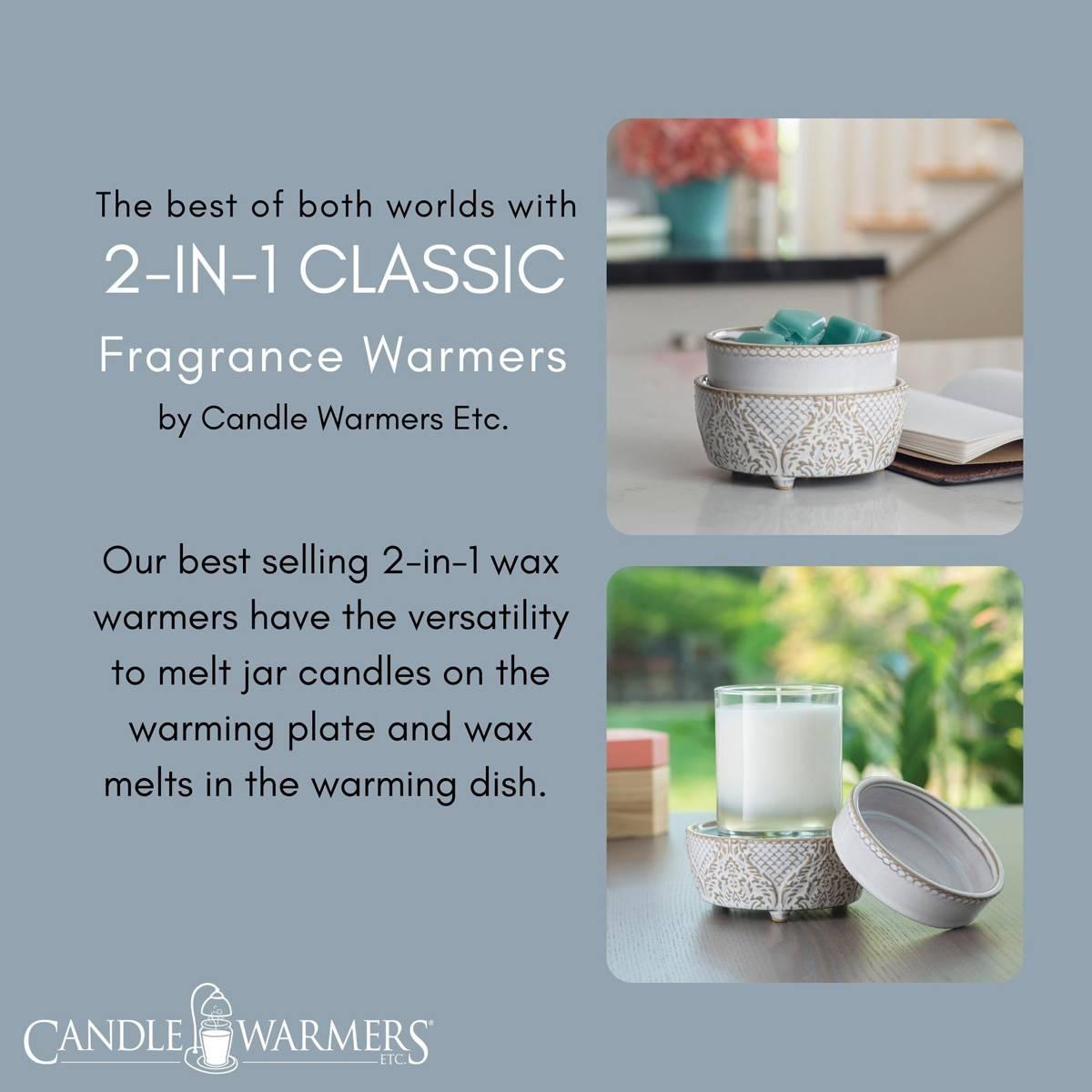 The Candle Warmers Etc. Vintage White 2-in-1 Wax Warmer is patterned like flocked wallpaper in an antique white reactive glaze and soft scalloping. It features a versatile design that allows you to warm wax melts in the dish, or place a jar candle directly on the warming plate. Candle and wax warmers allow you to enjoy the fragrance of a lit candle, without flame, soot, or other pollutants. Simply place your favorite candle on the warming plate, or add wax melts to the dish, turn it on, and enjoy your favorite fragrance as it spreads through the room.