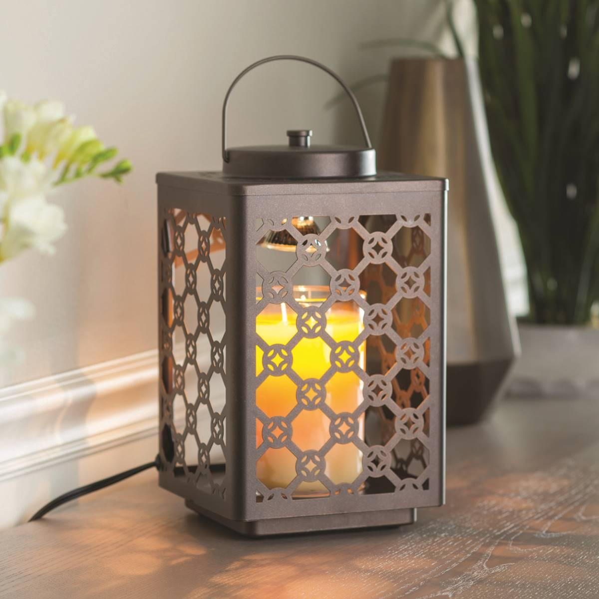 The Candle Warmers Etc. Garden Candle Warmer Lantern features elegant geometric cut-outs that cast an intricate pattern when lit. The matte-finished metal design comes in an oil rubbed bronze finish, lending a subtle flair of sophistication. This lantern uses a soft halogen bulb to warm a candle from the top down and allows you to enjoy the fragrance and ambiance of a lit candle, without flame, soot, or other pollutants. Place your favorite candle inside and enjoy the warm glow.