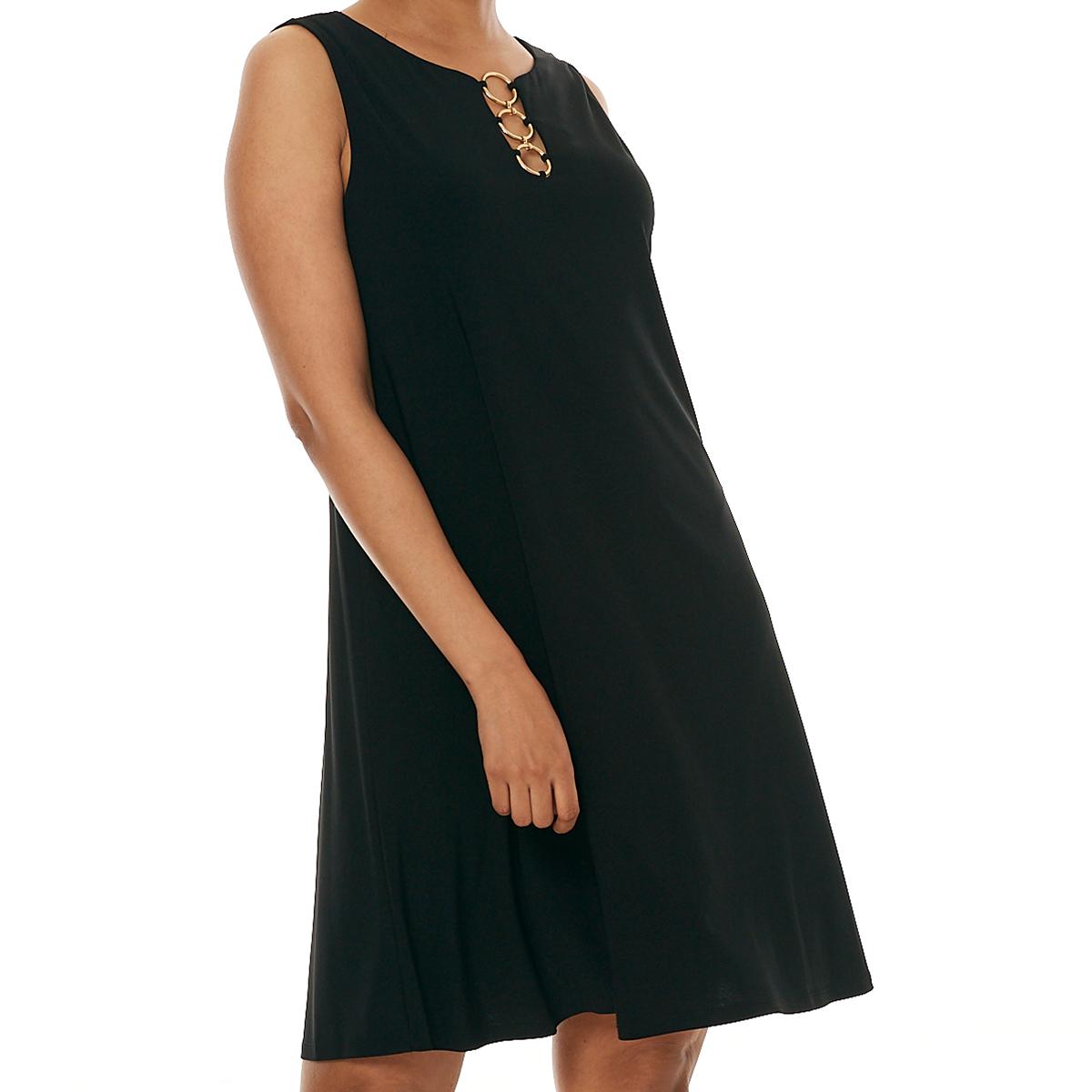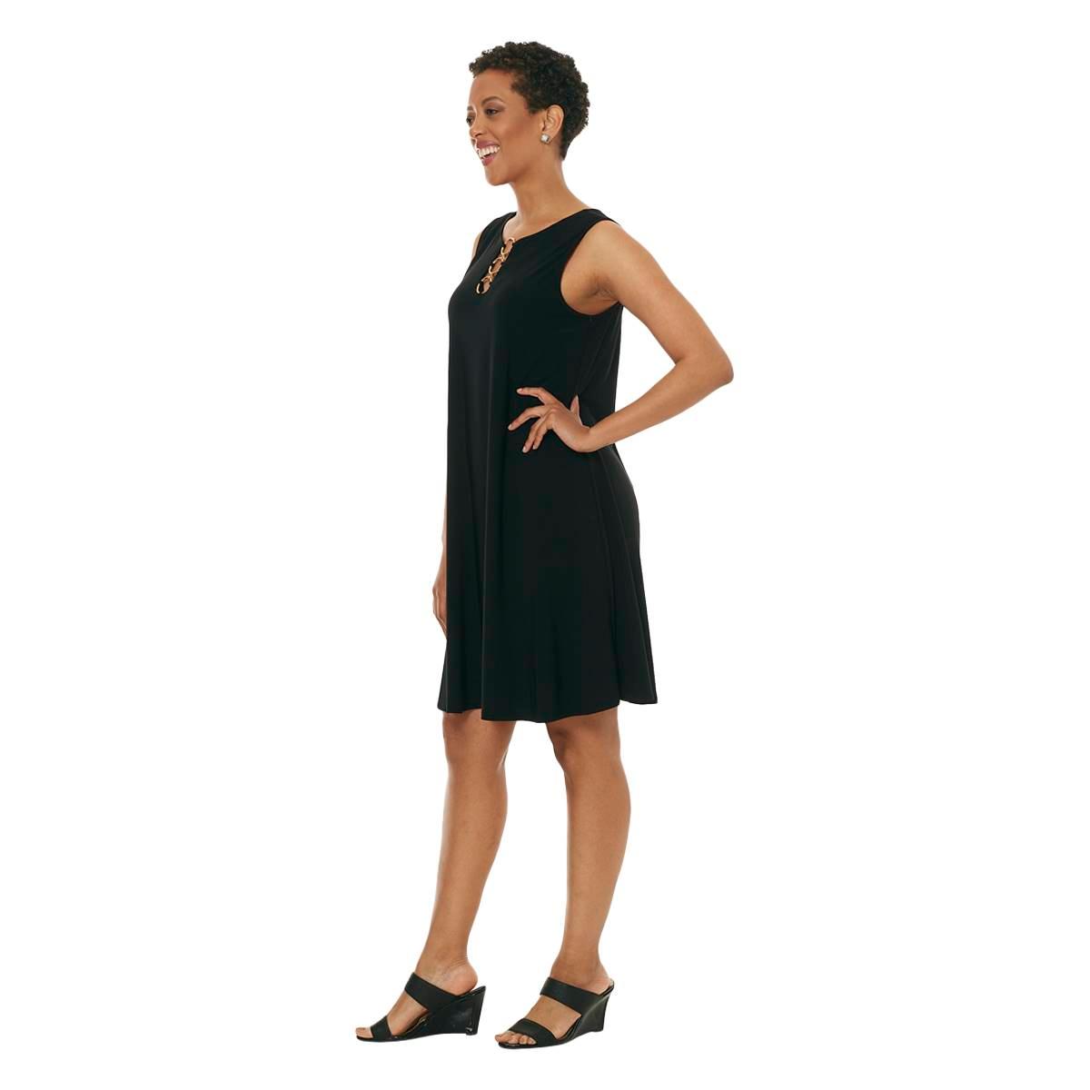 Description Maximize your trendy fashion with this Petite MSK shift dress. The solid style features a split neckline with three rings closure, sleeveless, and a pleated skirt....