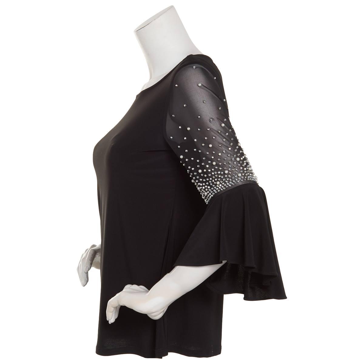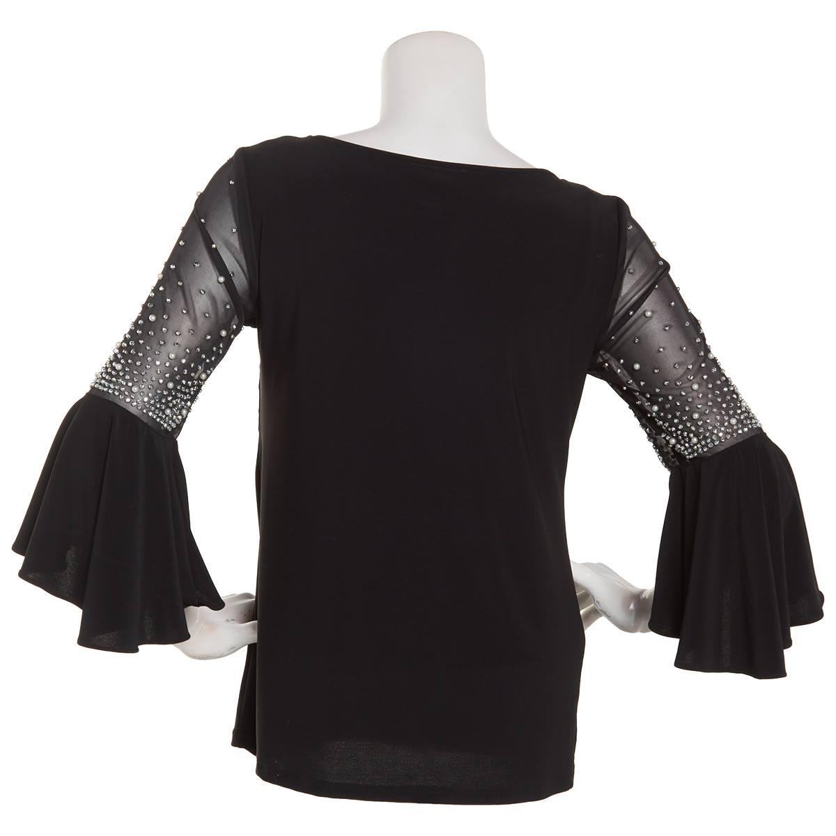 You´re going to love the soft, fluid drape of asymmetrical 3/4 bell sleeves on this Plus Size MSK beaded mesh inset blouse. Embellished with eye-catching studs and a boat neckline, this blouse is sure to become a go to for any night out.
