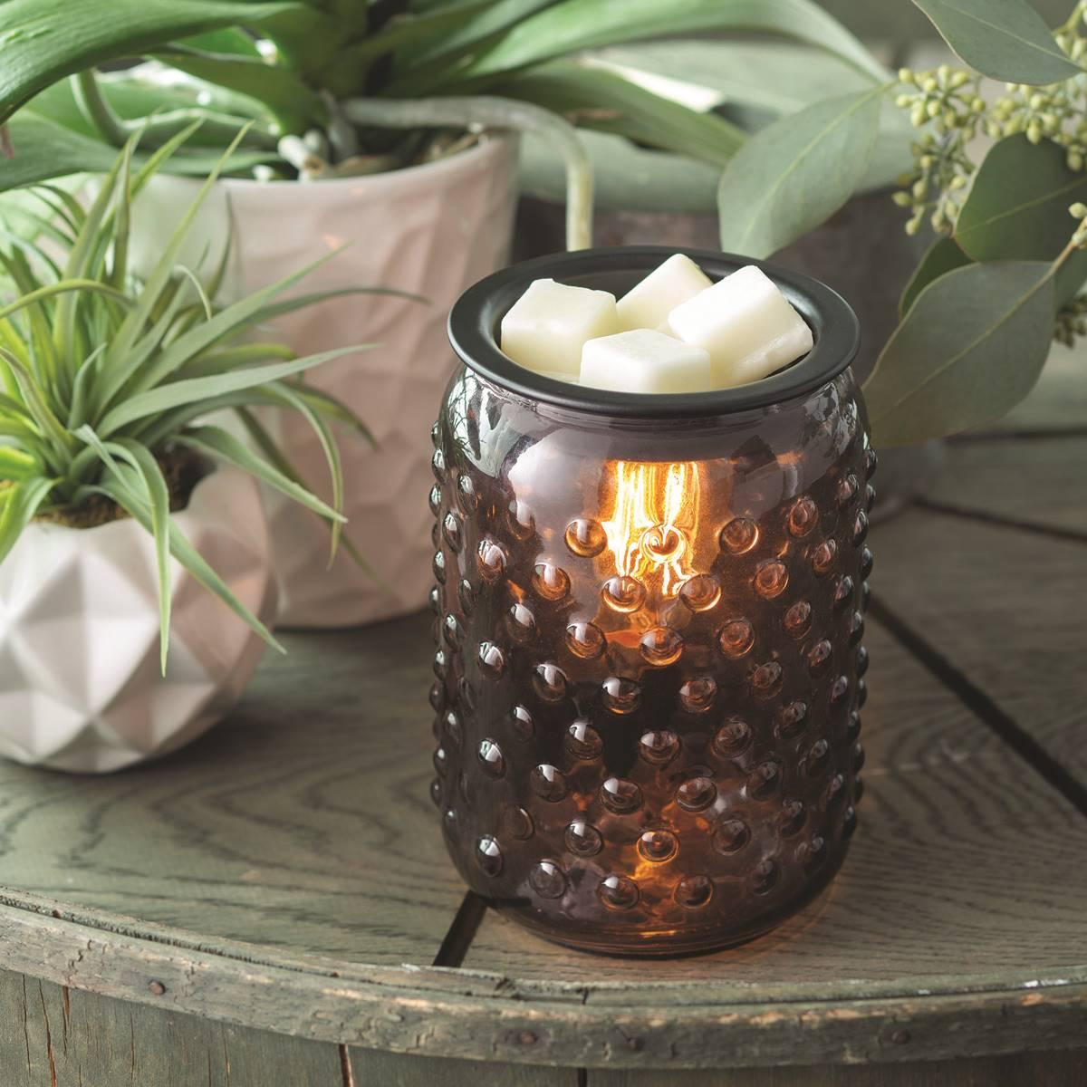 The Candle Warmers Etc. Smoky Hobnail Vintage Bulb Wax Warmer features a distinct glow, visible through a smokey, charcoal colored glass. This fragrance warmer uses a vintage style bulb to warm wax melts in the dish to release fragrance. The glow of the warmer creates a soft ambiance and fragrance of a lit candle without flame, soot, or other pollutants. Simply add wax melts to the dish, turn it on, and enjoy your favorite fragrance.Limited Manufacturer´s Warranty.