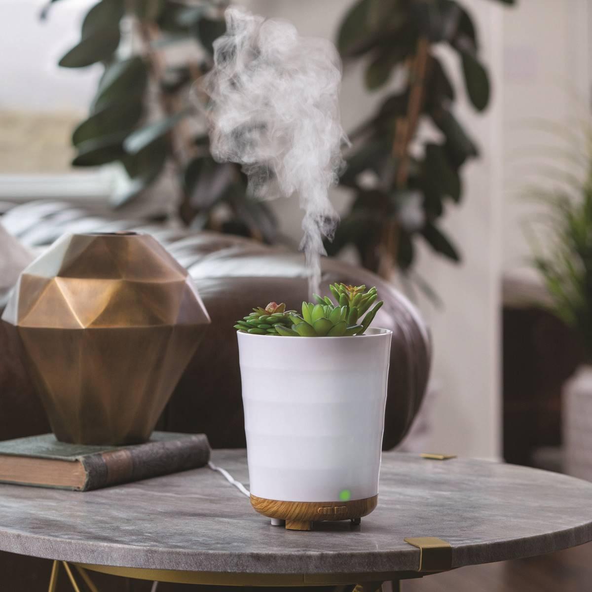 The Candle Warmers Etc. Potted Succulent Essential Oil Diffuser features a white ridged pot on a low-profile bamboo base that holds sweet succulent decorations in a fresh rock garden. The live plant feel is the perfect companion for diffusing your favorite essential oils. Includes diffuser, ceramic sleeve, measuring cup, and electrical cord. Features two mist modes for up to 8 hours of use, an auto shut-off feature, and a 100-milliliter capacity. Use to diffuse a refreshing mist of water and essential oils for aromatherapy benefits and natural fragrance that can enhance your mood.