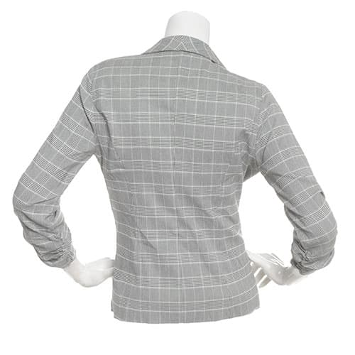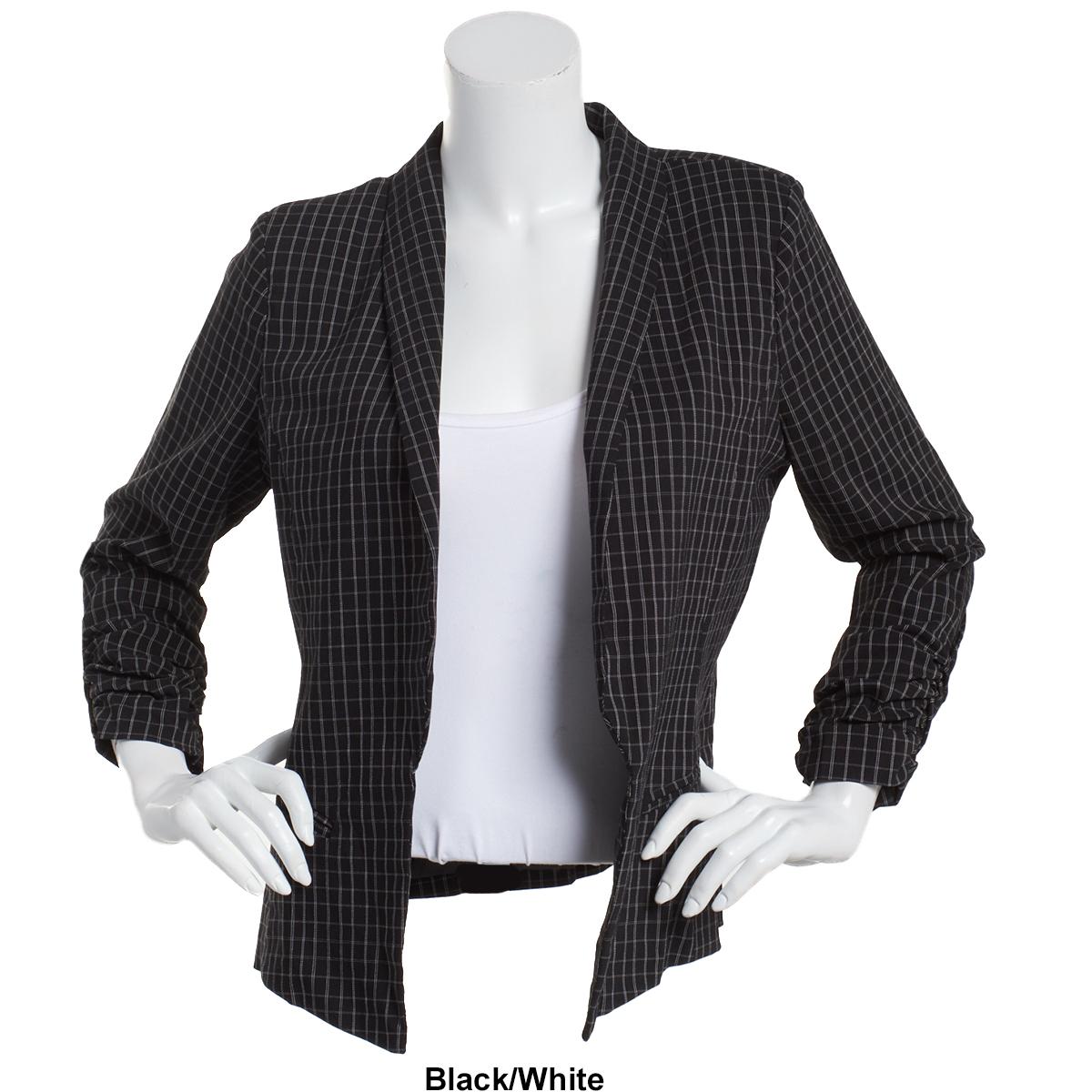 This Juniors Leighton millennium stretch-woven plaid blazer features ruched 3/4 length sleeves, an open front, and a smooth fabric lining. Look ready for work or pair with denim for a casual look.