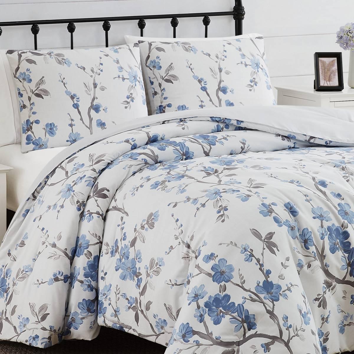 Spruce up your bedroom with the Cannon Kasumi Floral Comforter Set. This bedding set features a watercolor floral print on a white background with a solid white reverse. The blue flowers are enhanced with brush stroke detailing that continues throughout the bed up to the shams. The microfiber fabric allows for a soft and supple feel that will be comfortable all year round.