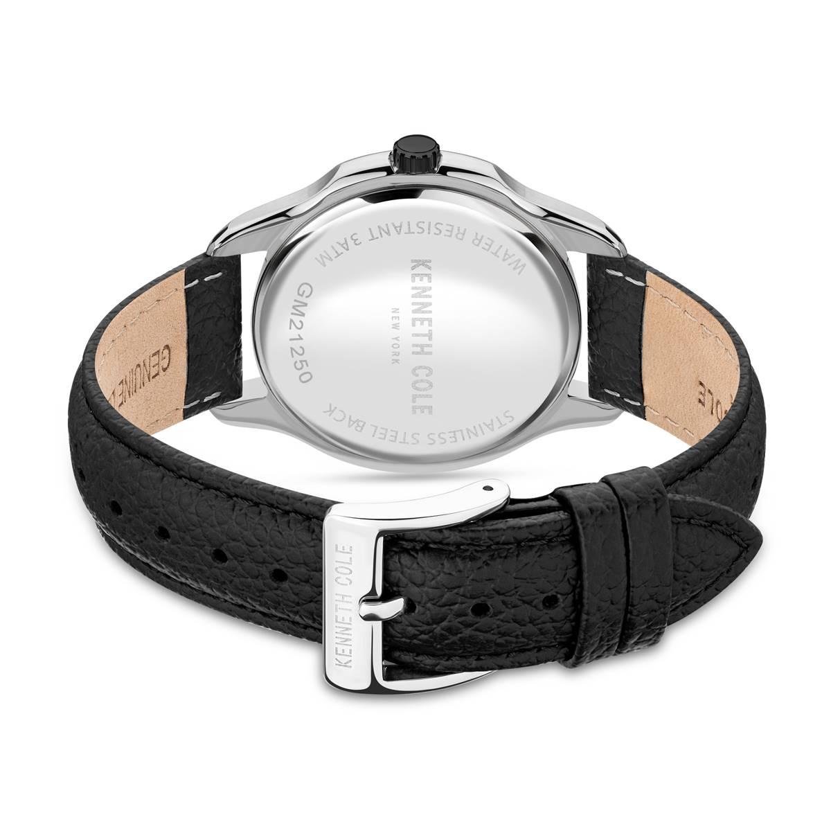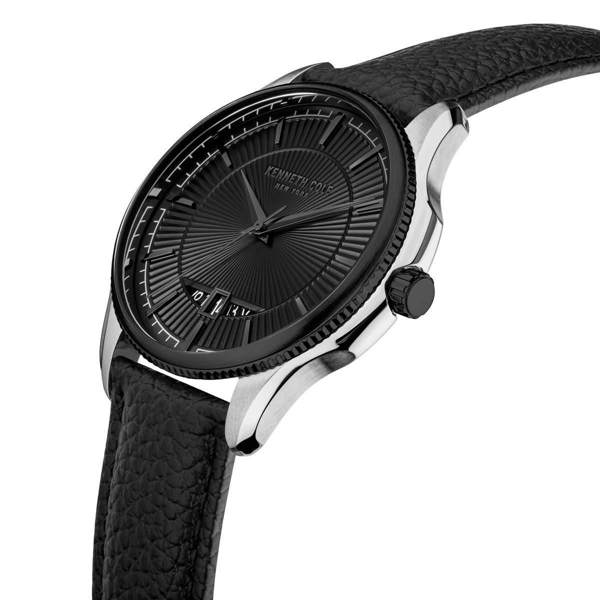 The Mens Kenneth Cole® New York Classic watch features a two-tone silver and black 42mm case with a coin edged bezel. The black textured dial has gun metal indexes and a date window at the six hour marker. The watch is completed with a black genuine leather strap.