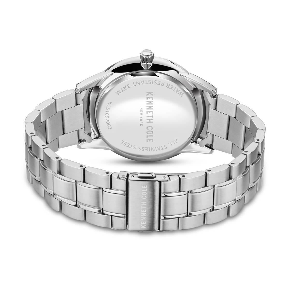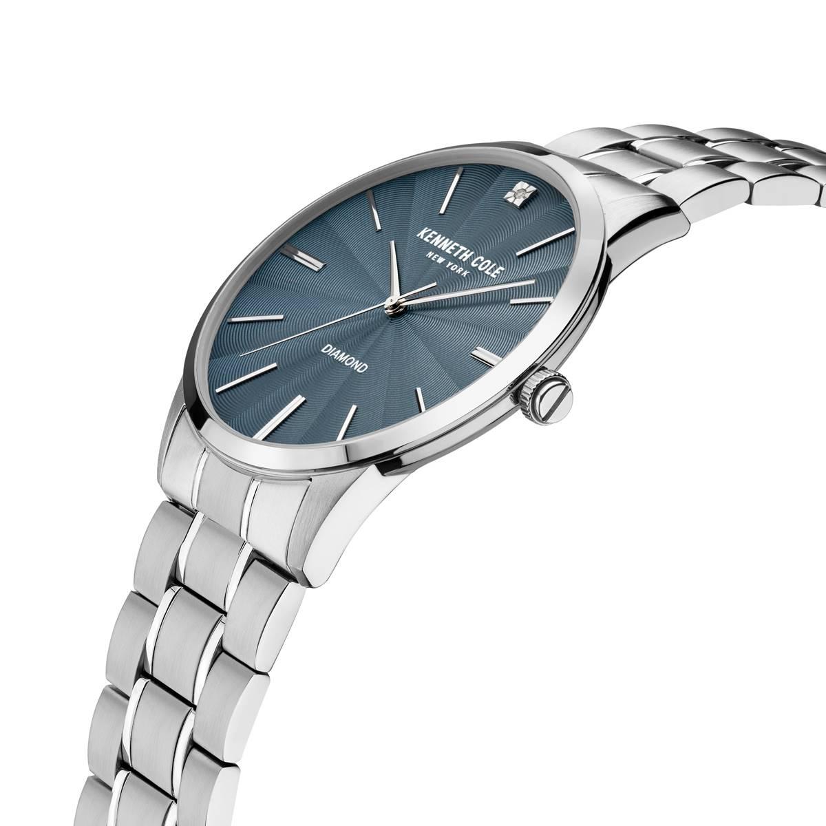 The Mens Kenneth Cole® New York Genuine Diamond watch features a silver 43.5mm case. The textured light blue dial has silver hour markers and is accented with a genuine diamond at the 12-hour marker. The watch is completed with a silver bracelet.