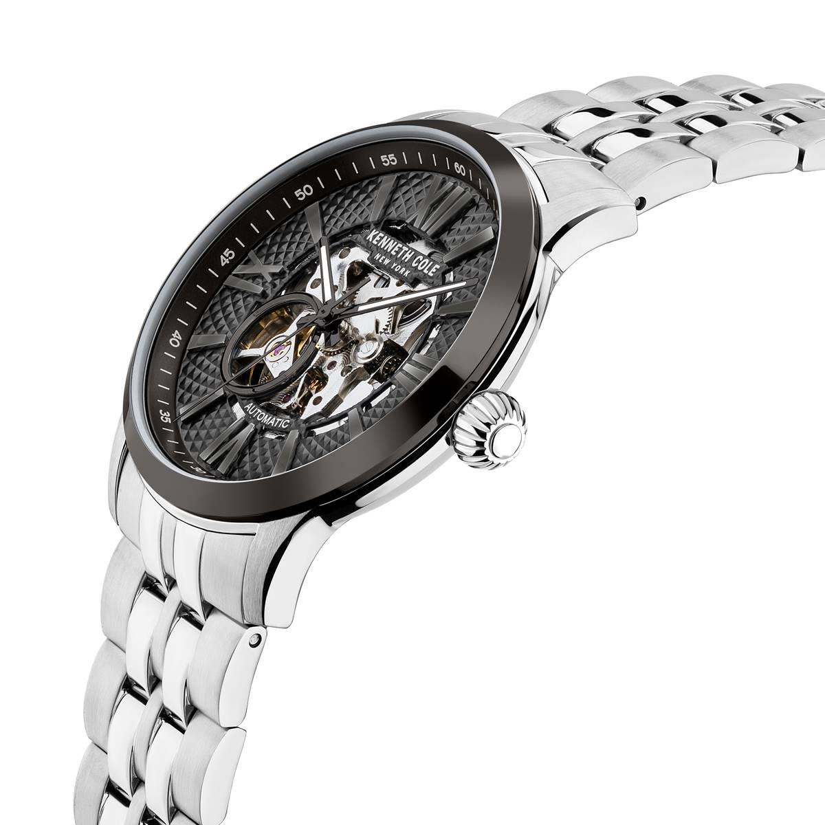 The Mens Kenneth Cole® New York Auto Movement watch features a two-tone silver and gunmetal 43mm case. The inner workings of the automatic movement are highlighted with a black outer dial with gunmetal hour markers. The watch is complemented with a silver bracelet.