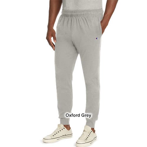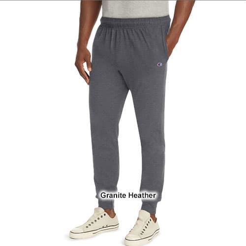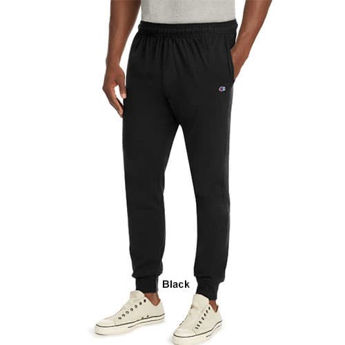 Description Be comfortable and in style with these Mens Champion® jersey knit joggers. They include an elastic waist with a drawstring, side seam pockets, a Champion® logo...