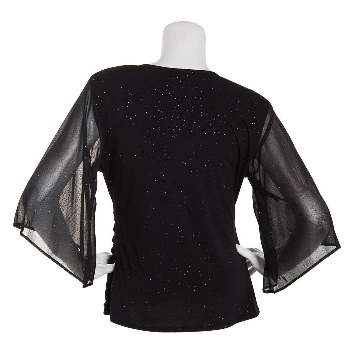 Brighten your classy wardrobe with this Womens MSK wrap front mesh side ruched blouse that has a surplice neck. This stretch top has a ruched side detail with glitter and elbow length sleeves. Match this top with a skirt or any elegant bottoms to complete your professional look.