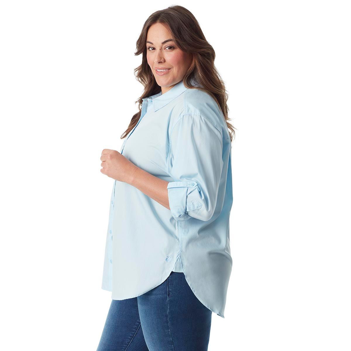 The Plus Size Gloria Vanderbilt Amanda wrinkle free cotton solid poplin top features classic flattering fits that will make you feel beautiful and remarkable quality fabric for a comfortable feel.