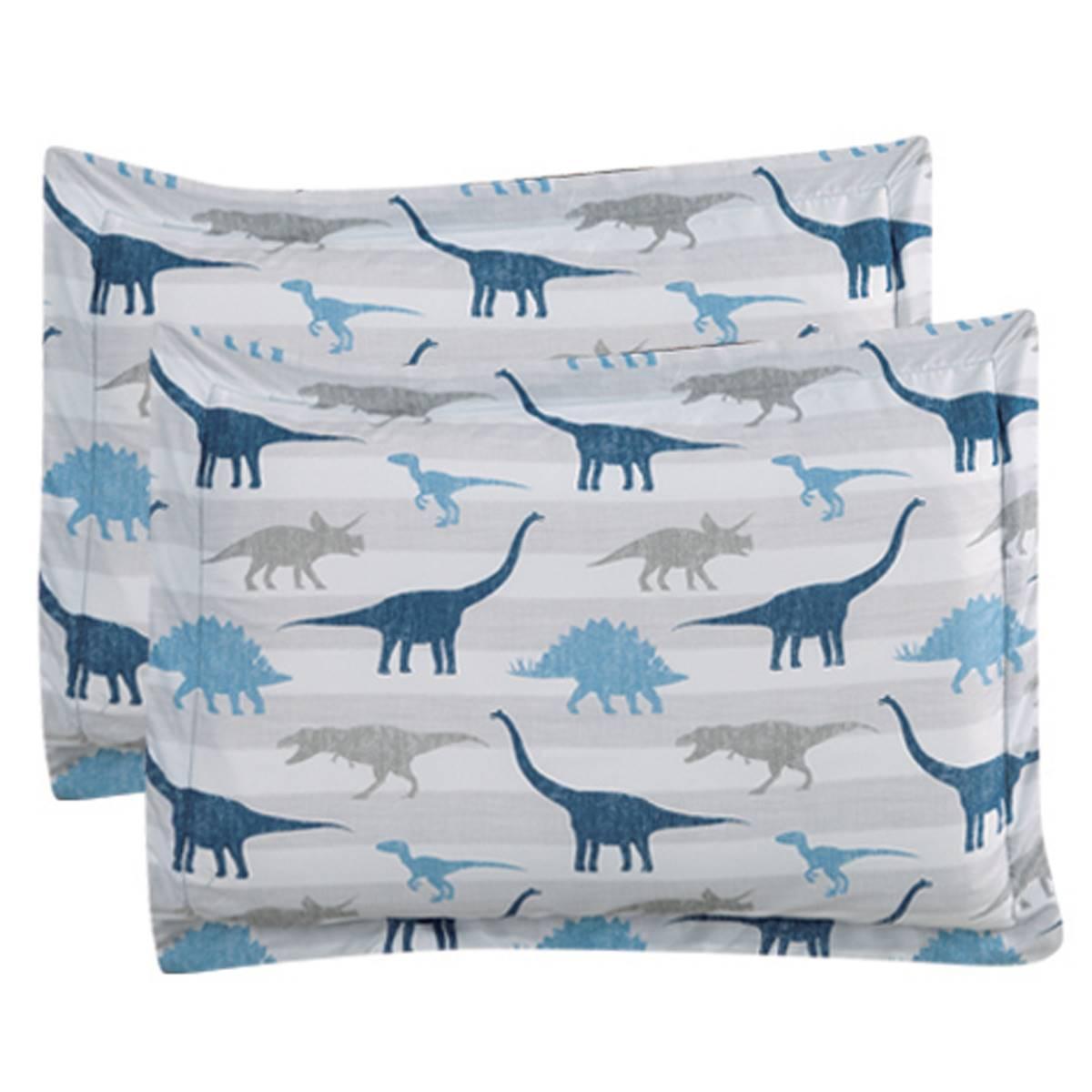 Prehistoric dinosaur silhouettes in shades of blue trail upon grey and white stripes for this Alex & Bella Dino Print Microfiber Comforter Set. The printing technique is textured to look like a printed chambray woven fabric adding interest and a soft look.